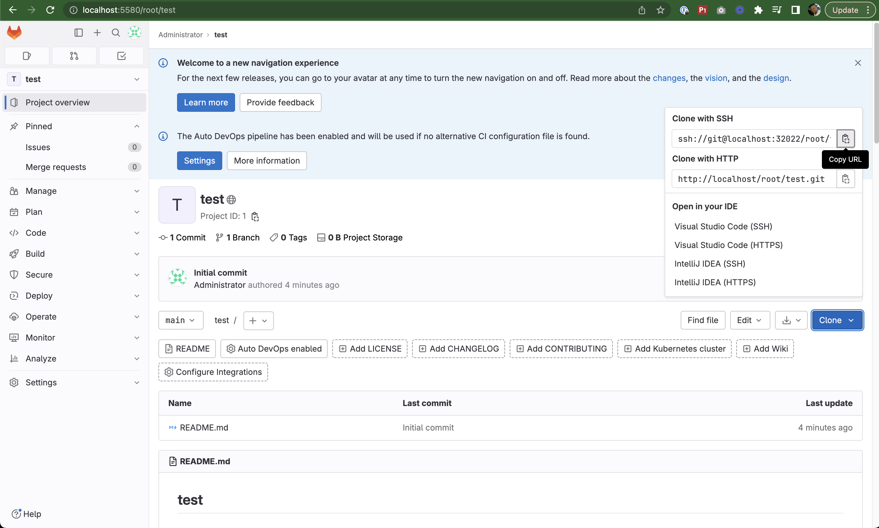 I will clone this to my ~/workspace/personal/test directory, and I will use this command git clone ssh://git@localhost:32022/root/test.git