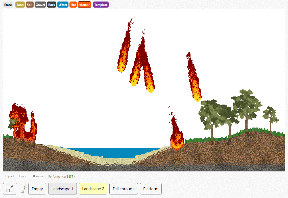 Sand Game JS is a fast and powerful falling-sand game engine for desktop & mobile browsers. It allows players to experiment with various elements, such as sand, soil, water and fire. It is primarily tested on Google Chrome and Google Chrome for Android. WebGL 2 is utilized for fast rendering.