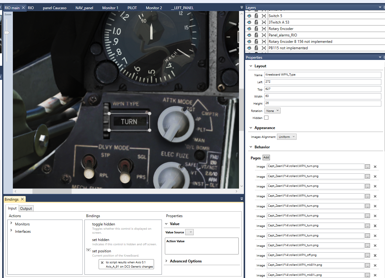 In this example the kneeboard control has been used to show the weapon selected on the F14 profile, and controlled by a DCS value: