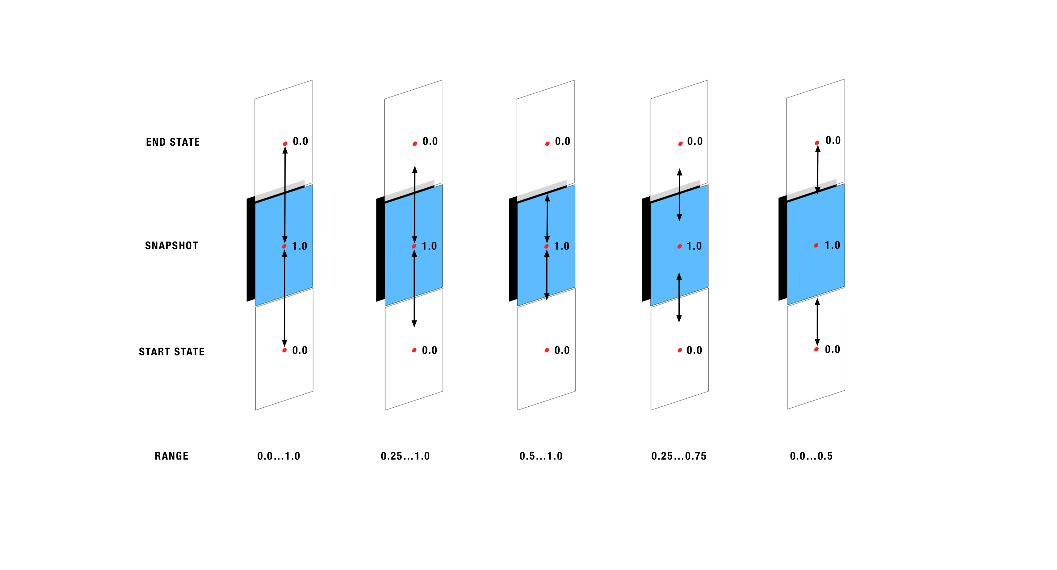 Ranges can be defined on a per property basis just like easing – thus allowing for different properties interpolating over different coordinate spaces. The following example defines two different ranges for each property, and can visually be referenced above as to where the interpolation will take place.