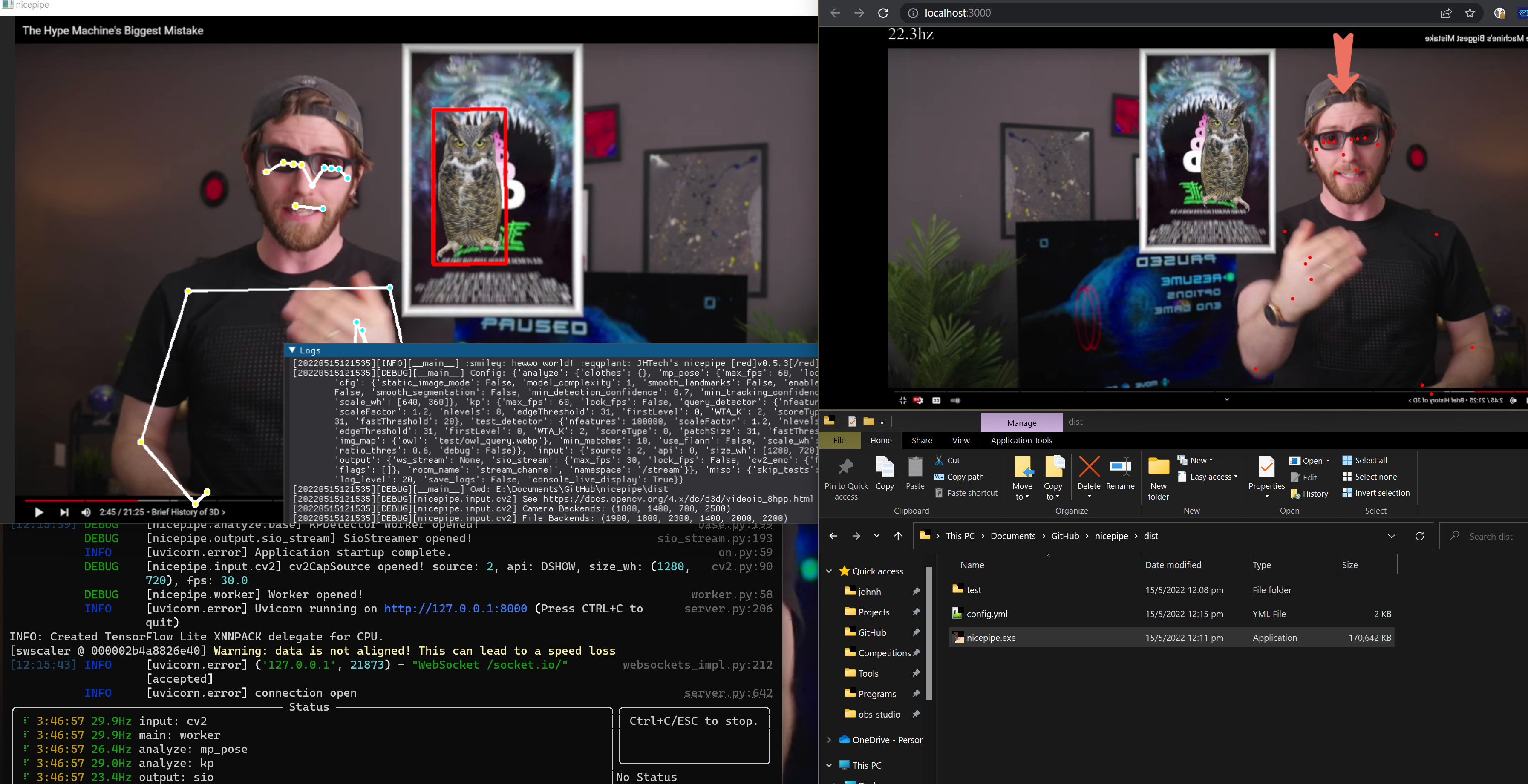 Actually let me reexplain. Nicepipe aims to be multi-process computer vision pipeline. It takes in video & outputs analysis using components such as feature detectors, tracking & object detection. This analysis is then received by a frontend client for further visualization.