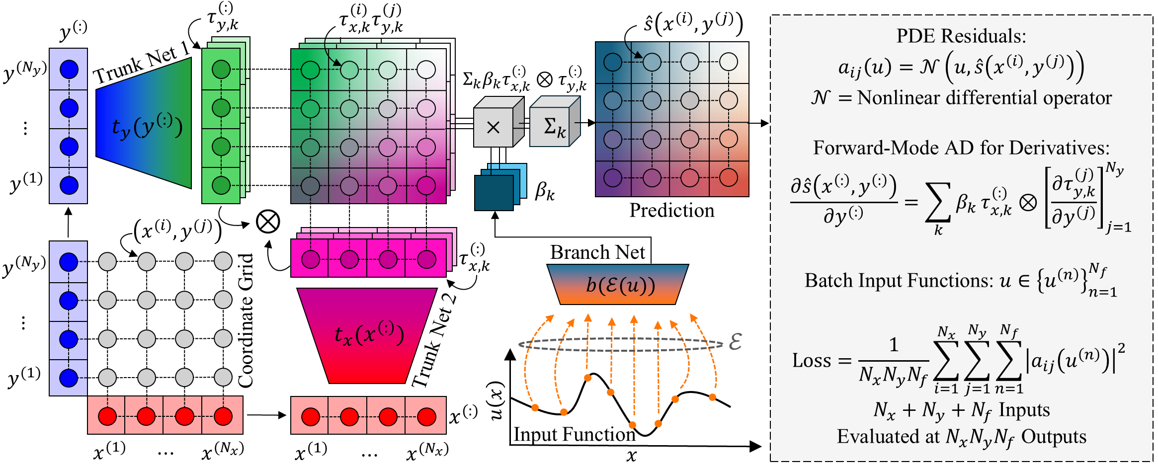 pip install separable-operator-networks[cuda12]Operator learning has become a powerful tool in machine learning for modeling complex physical systems governed by partial differential equations (PDEs). Although Deep Operator Networks (DeepONet) show promise, they require extensive data acquisition. Physics-informed DeepONets (PI-DeepONet) mitigate data scarcity but suffer from inefficient training processes. We introduce Separable Operator Networks (SepONet), a novel framework that significantly enhances the efficiency of physics-informed operator learning. SepONet uses independent trunk networks to learn basis functions separately for different coordinate axes, enabling faster and more memory-efficient training via forward-mode automatic differentiation. The SepONet architecture for a