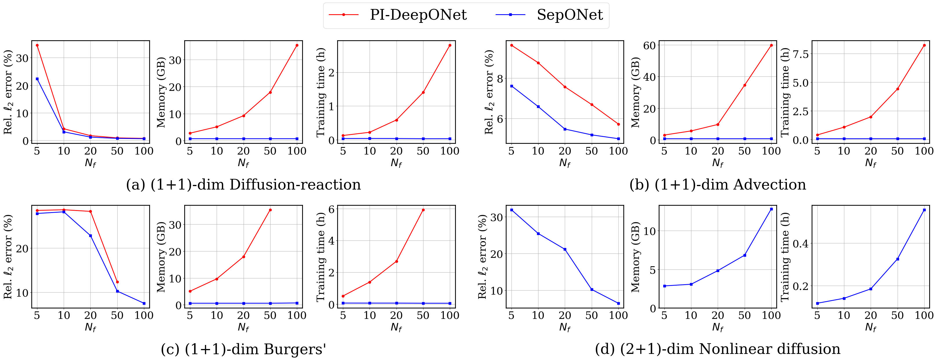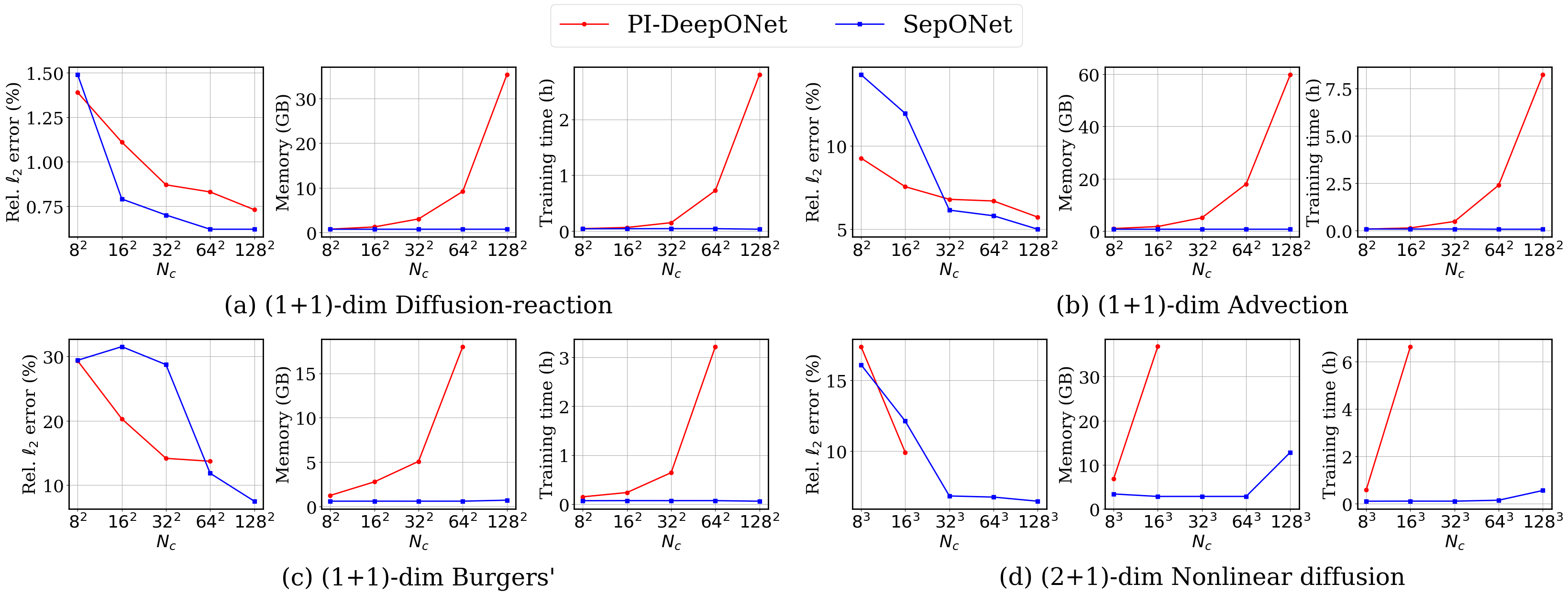 Our preprint provides a universal approximation theorem for SepONet proving that it generalizes to arbitrary operator learning problems. For a variety of 1D time-dependent PDEs, SepONet has similar accuracy scaling to PI-DeepONet, but with as much as 112x faster training time and 82x reduction in GPU memory usage. For 2D time-dependent PDEs, SepONet is capable of accurate predictions at scales where PI-DeepONet fails. The full test scaling results as a function of the number of collocation points and number of input functions is shown below. These results may be reproduced using our scripts.