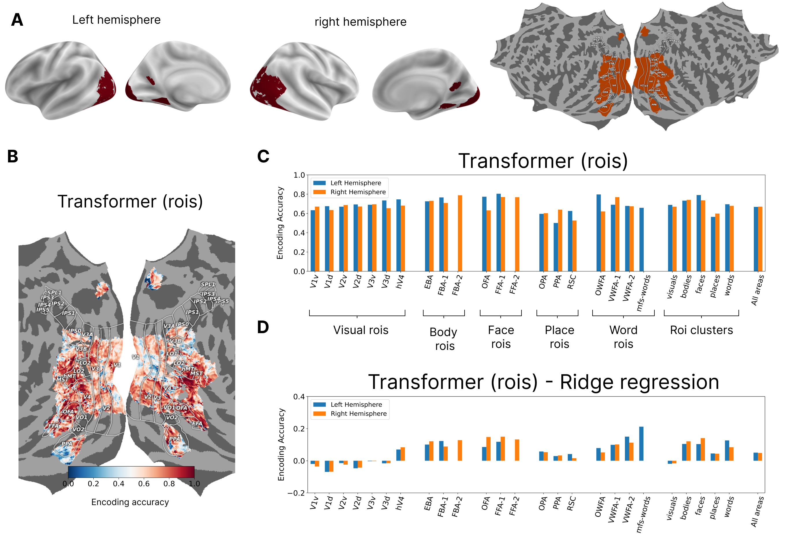 A. The general region of interest for highly visually responsive vertices in the back of the brain shown on different surface maps. B. Encoding accuracy (fraction of explained variance) shown for Subject 1 for all the vertices for the transformer model using ROIs for decoder queries. C. Encoding accuracy for individual ROIs and for ROI clusters based on category selectivity for the two hemispheres. D. The differences in encoding accuracy between the transformer and the ridge regression models showing that improvement in the former is driven by better prediction of higher visual areas.