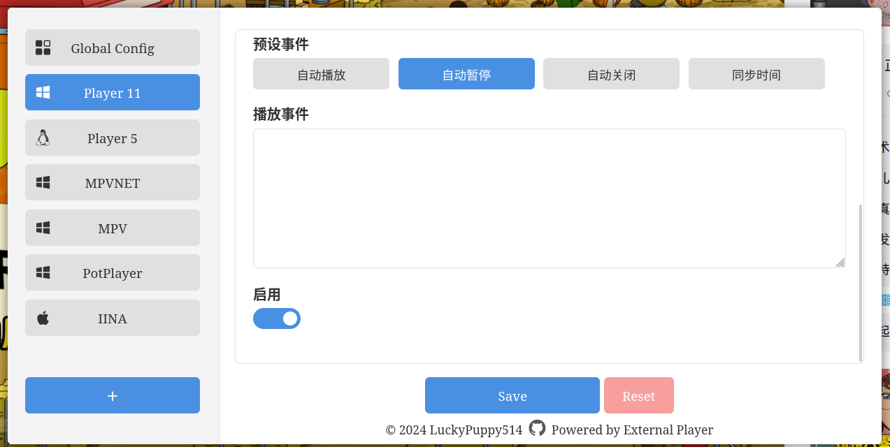 i-mpv dev for external player a Scheme Handler 食用方法 将项目扔到预期的目录下,比如/var/impv,随后 sudo 执行 ./install.sh 左下角打开 external-player 的设置,就这个小齿轮 再点击左下角的新增,把 event.js 复制到 播放事件 之中即可 必要依赖 必须提前安装 mpv 以及 external-player