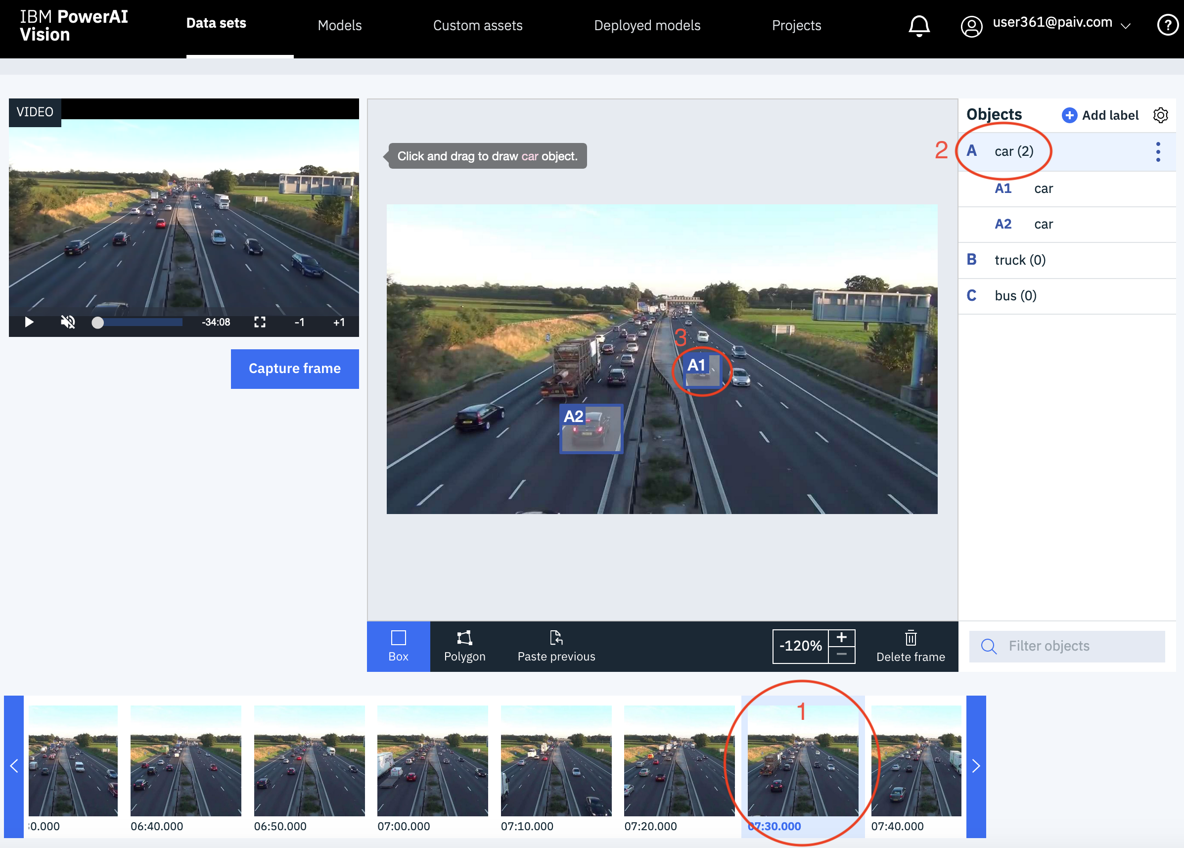 Next, we'll split the training video into multiple frames. We'll label objects in a few of the frames manually. After generating a model, we can automatically label the rest of the frames to increase accuracy.
