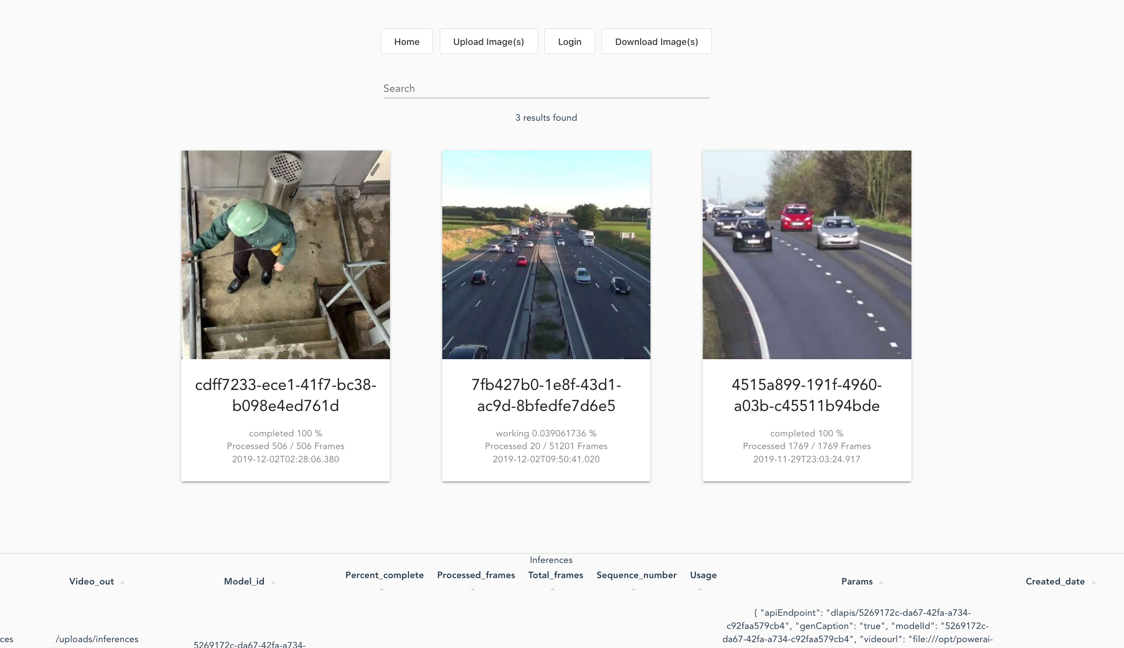 As images are uploaded to the IBM Maximo Visual Inspection service, they'll be shown in a grid in the main dashboard view. We can use the "Search" input to filter the image analysis results by time, model id, object type, etc. Also, the annotated images can be downloaded as a zip file by clicking the "Download Images" button.