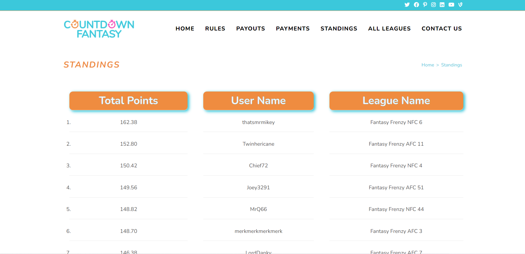 I pulled several external APIs from the Sleeper Fantasy Football website in order to gather the points, username, and leaguename data from 152 different leagues within the Sleeper system. The data is sorted in decending order of points to get the standings of the Fantasy Frenzy Tournament. I did this so that each fantasy football competitor could see where their team stands for the final week. Otherwise, it would be impossible for each compeititor to see where they stand compared to the other 151 leagues. In total there are 304 teams.