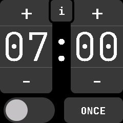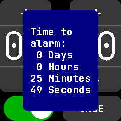 I propose to show the "Time to alarm:" overlay by swiping upwards instead of using a button for it, just as it is in the music app to show the volume controls. Swiping up might be a good default gesture for additional features anyways, as if there is one default people are more likely to "discover" these across different screens, even if there is no visible control element. It also doesn't clutter the screen and helps with the problem of hitting small buttons reliably. |