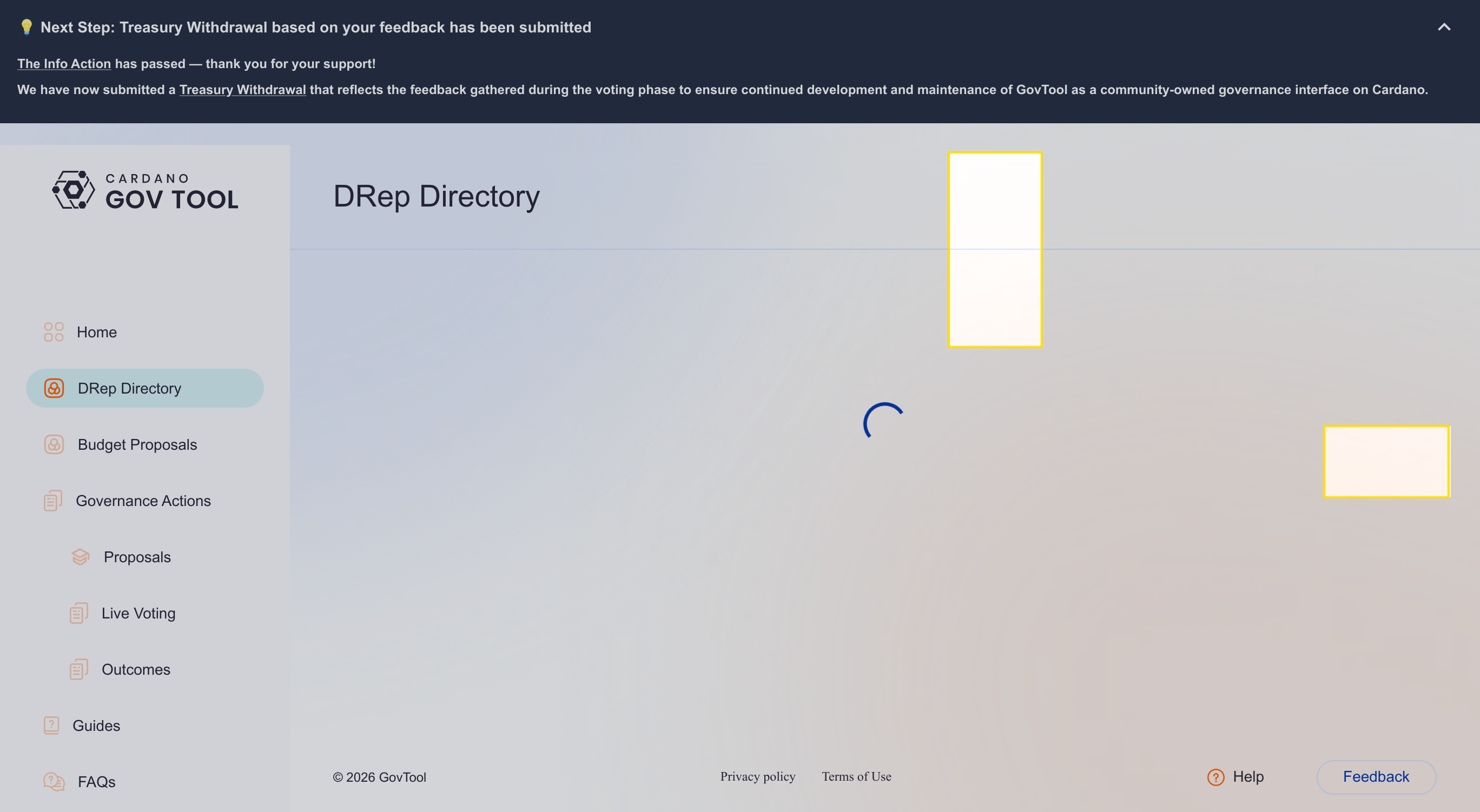 **Taken at**: https://gov.tools/connected/drep_directory **Fields**: - Noticed an issue?: nothing is loading....  *[Download original image](https://resources.usersnap.com/company/9d874115-0f65-4996-8ead-fe053ac30f45/datapoint_screenshot/18348ccb-5156-4dd4-9e4b-22c14aa32a90-annotated_1f60d676-fa16-428f-ba45-dba41d8899b4.png?etag=498ad6a8d88828acabba68662522b6c3)* **Browser**: Chrome 143 (Windows 10) **Screen size**: 1368x912 **Browser size**: 1368x751 **[Open #89 in Usersnap](https://app.usersnap.com/l/feedback/4757a800-99f3-4545-ba8e-bdcb29f703c8?utm_medium=integration&utm_campaign=integration&utm_content=open)** Powered by **[Usersnap](https://usersnap.com/?utm_source=product&utm_medium=poweredbylink&utm_campaign=github_entry)**.