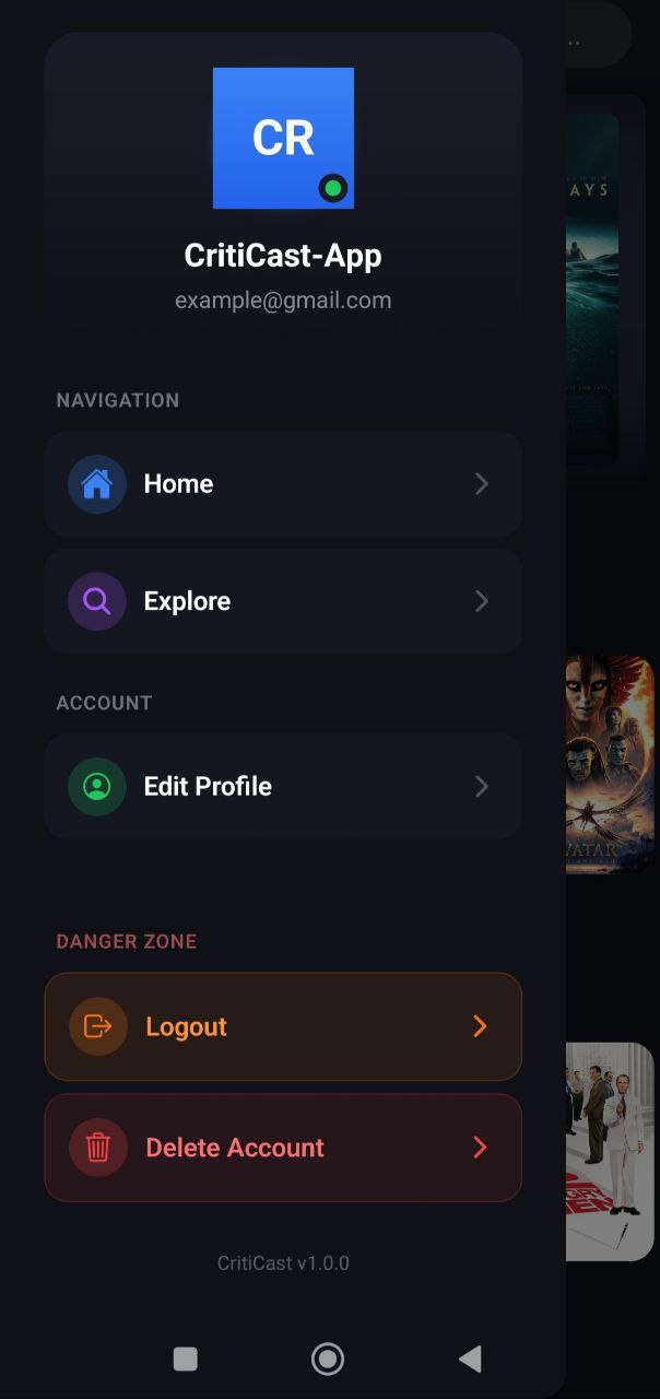 CritiCast is a modern, cross-platform movie and series review application built with React Native and Expo. It provides a rich user experience for browsing, searching, and rating films, powered by The Movie Database (TMDB) API and a custom backend.