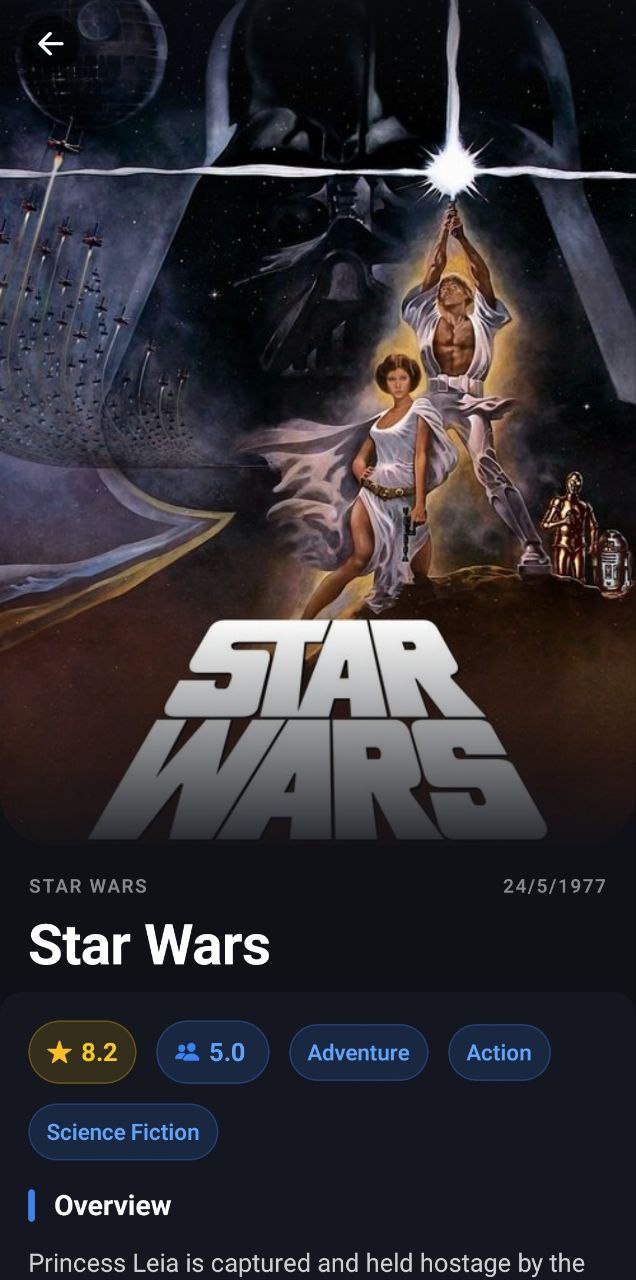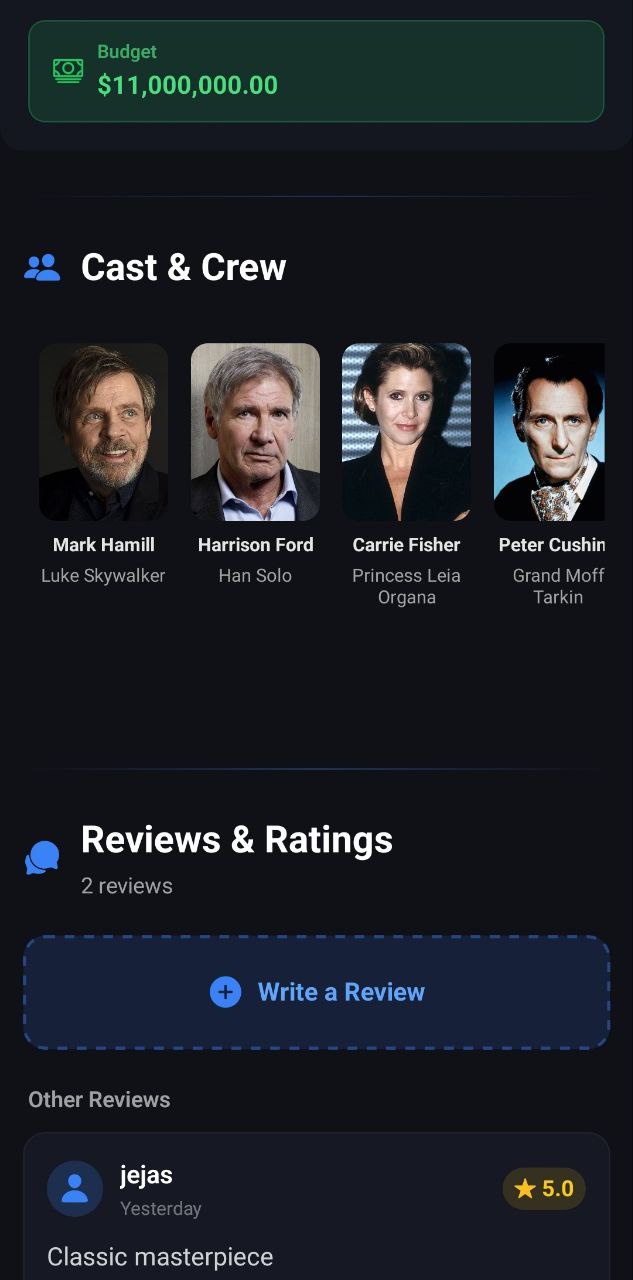 - Detailed Movie Information: View comprehensive details for each movie, including synopsis, cast, budget, genres, and both TMDB and user ratings.