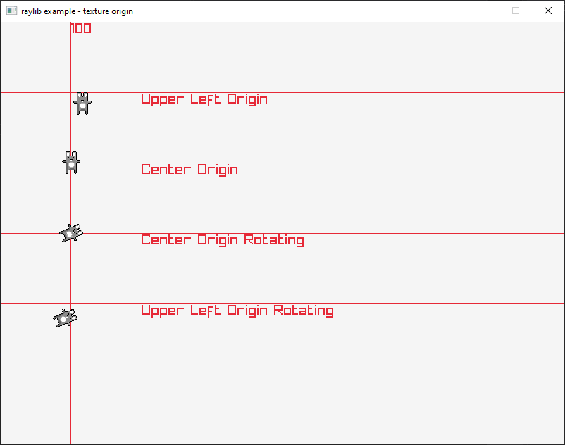 You can see in this example that even though the second bunny has a destination rectangle X of 100, the left side is not at 100 like the first one that has no origin offset. The origin offset for the second bunny is subtracted from it's rectangle so that the bunny is centered on the coordinates specified (100,200).