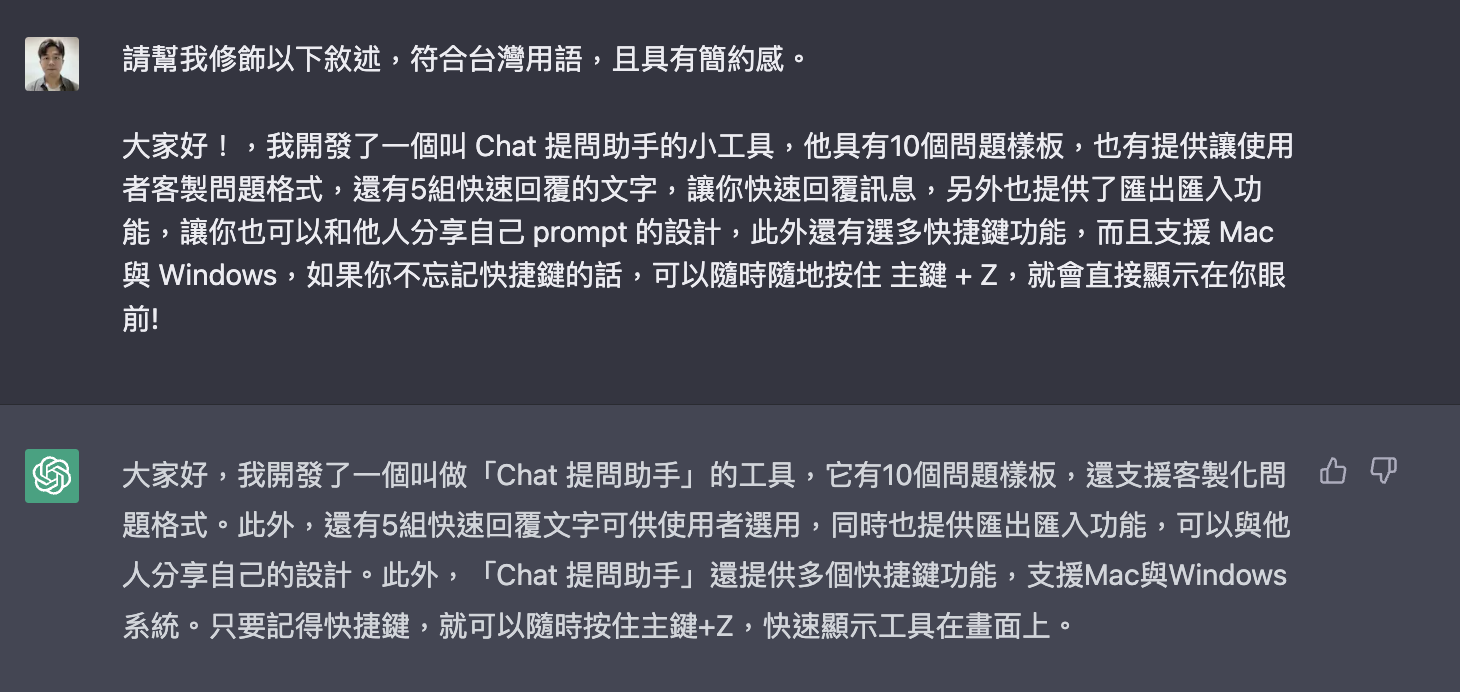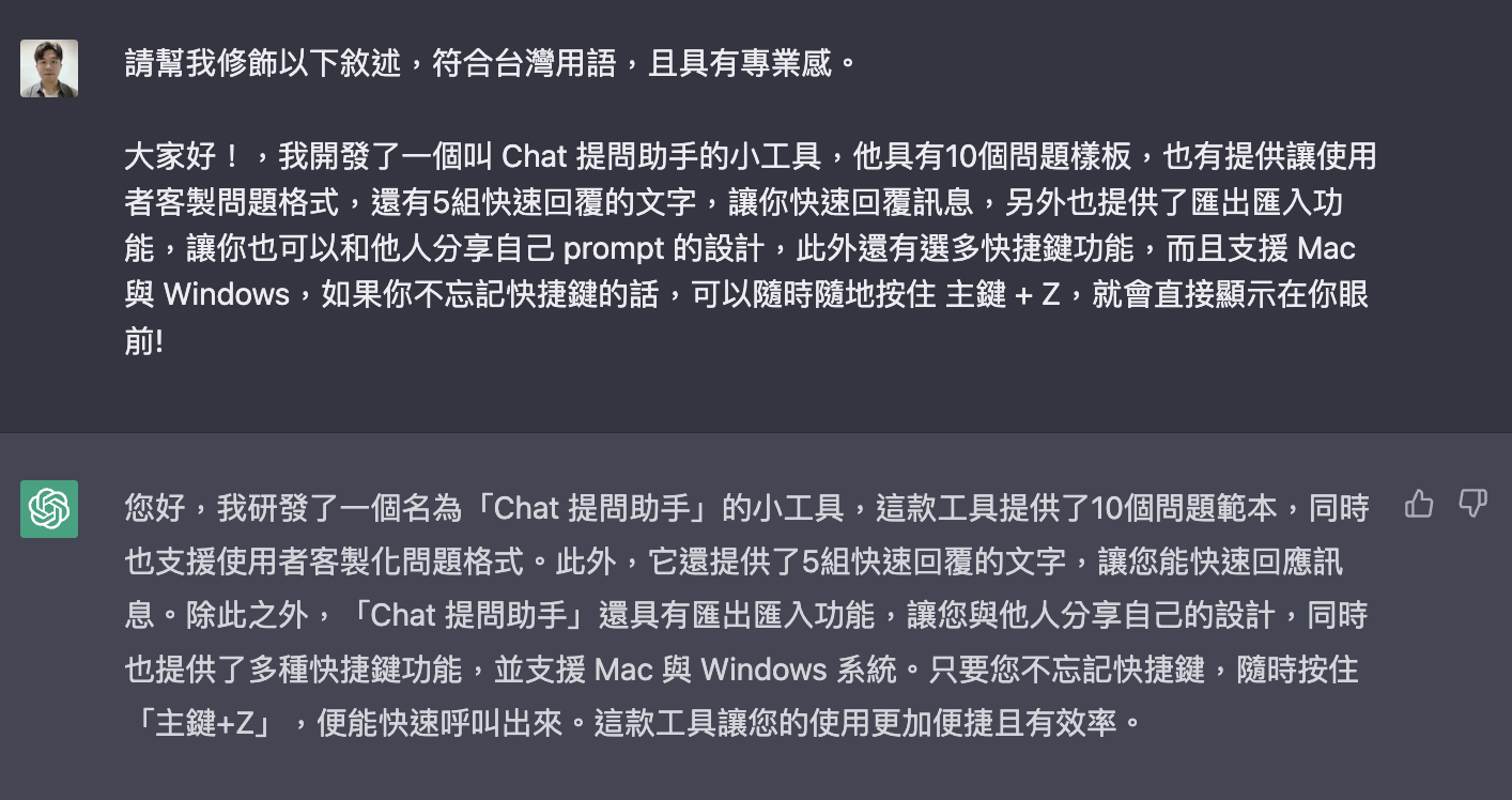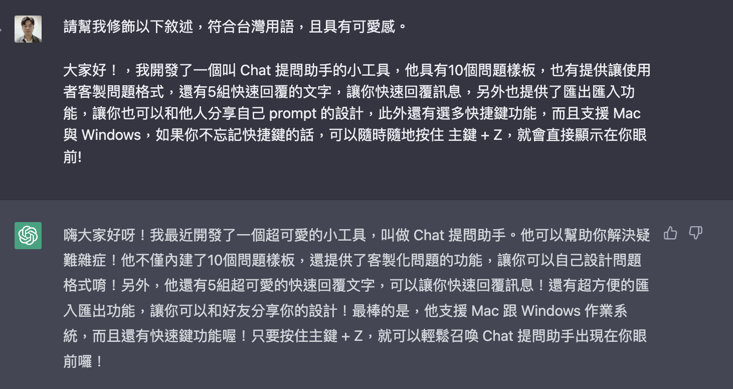 分享一個小訣竅,其實可以根據不同情境,選擇不同的感覺描述方式,例如具有專業感、具有簡約感,甚至是具有可愛感等等,就可以讓 ChatGPT 修飾出您想要的版本!