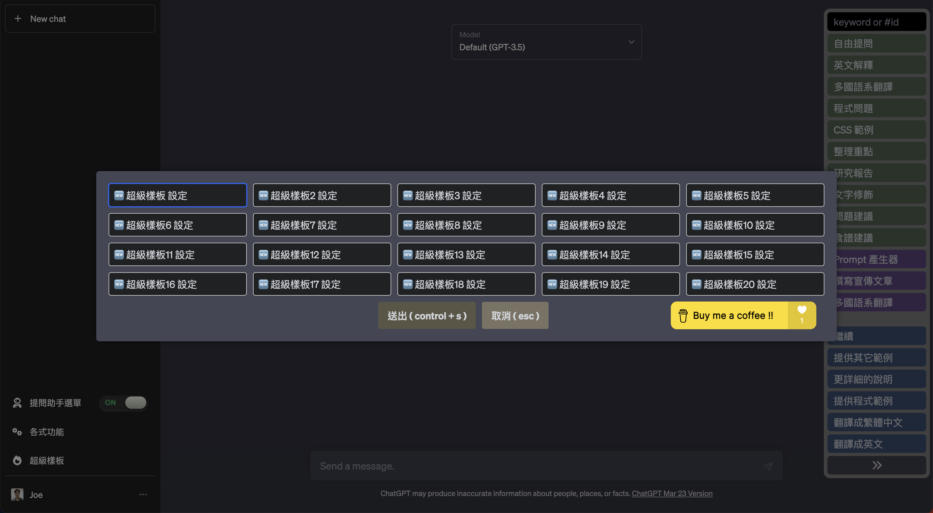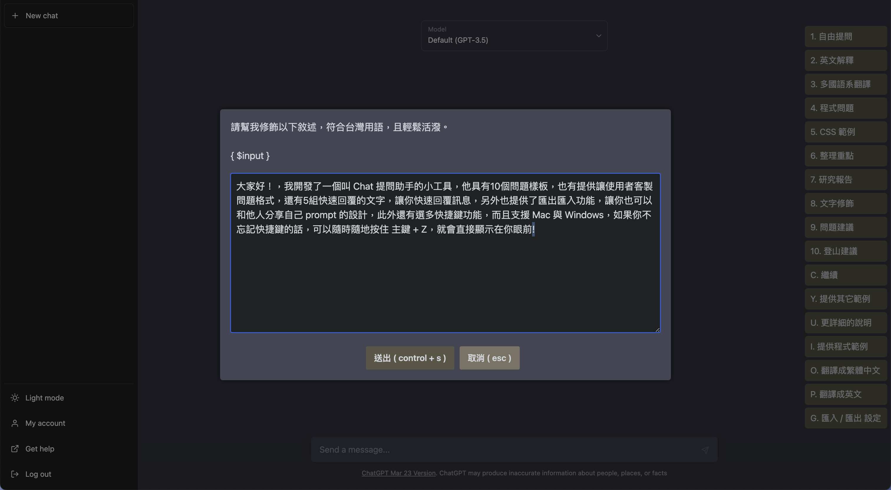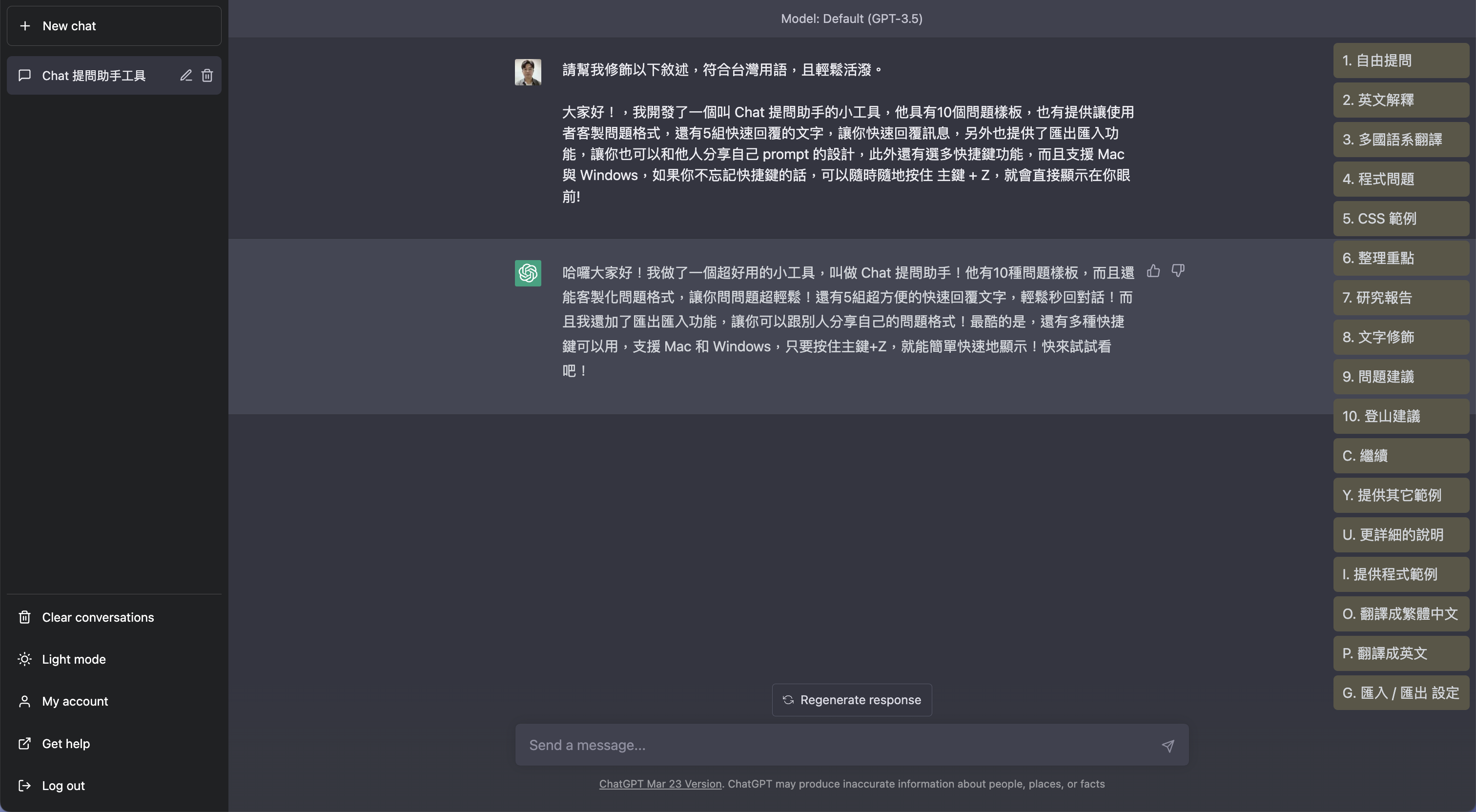 此工具能夠幫助您更有效率地與 ChatGPT 進行對話,並提供了多種問題範本、快速回覆文字,以及方便的快捷鍵功能。