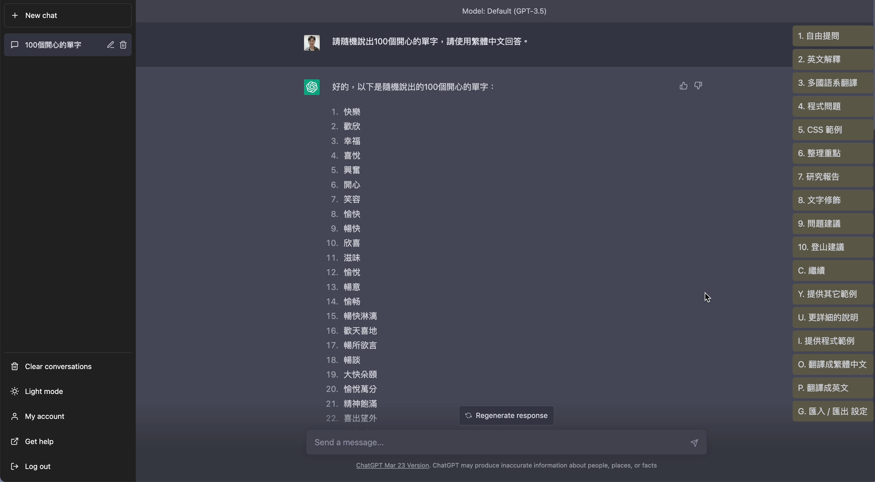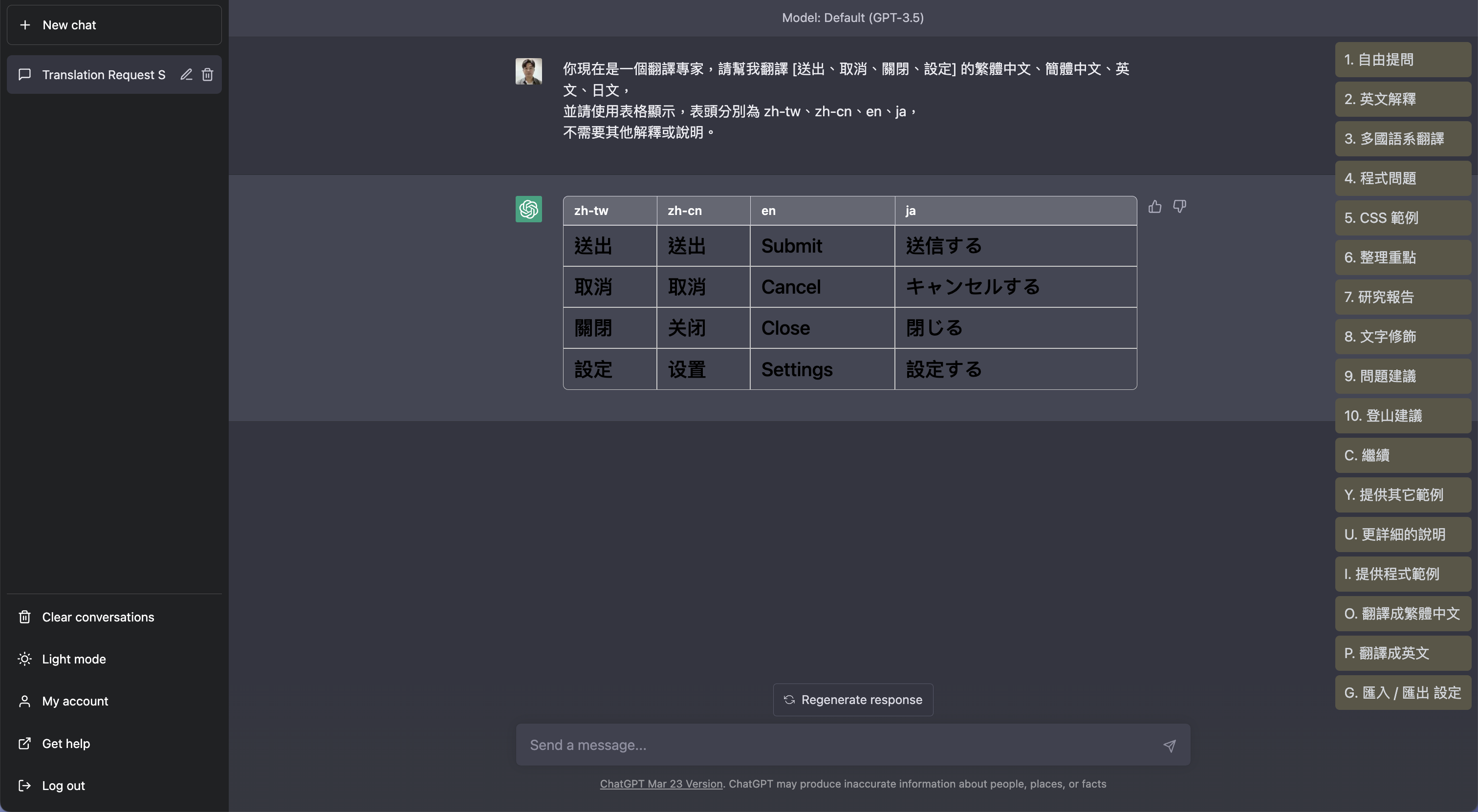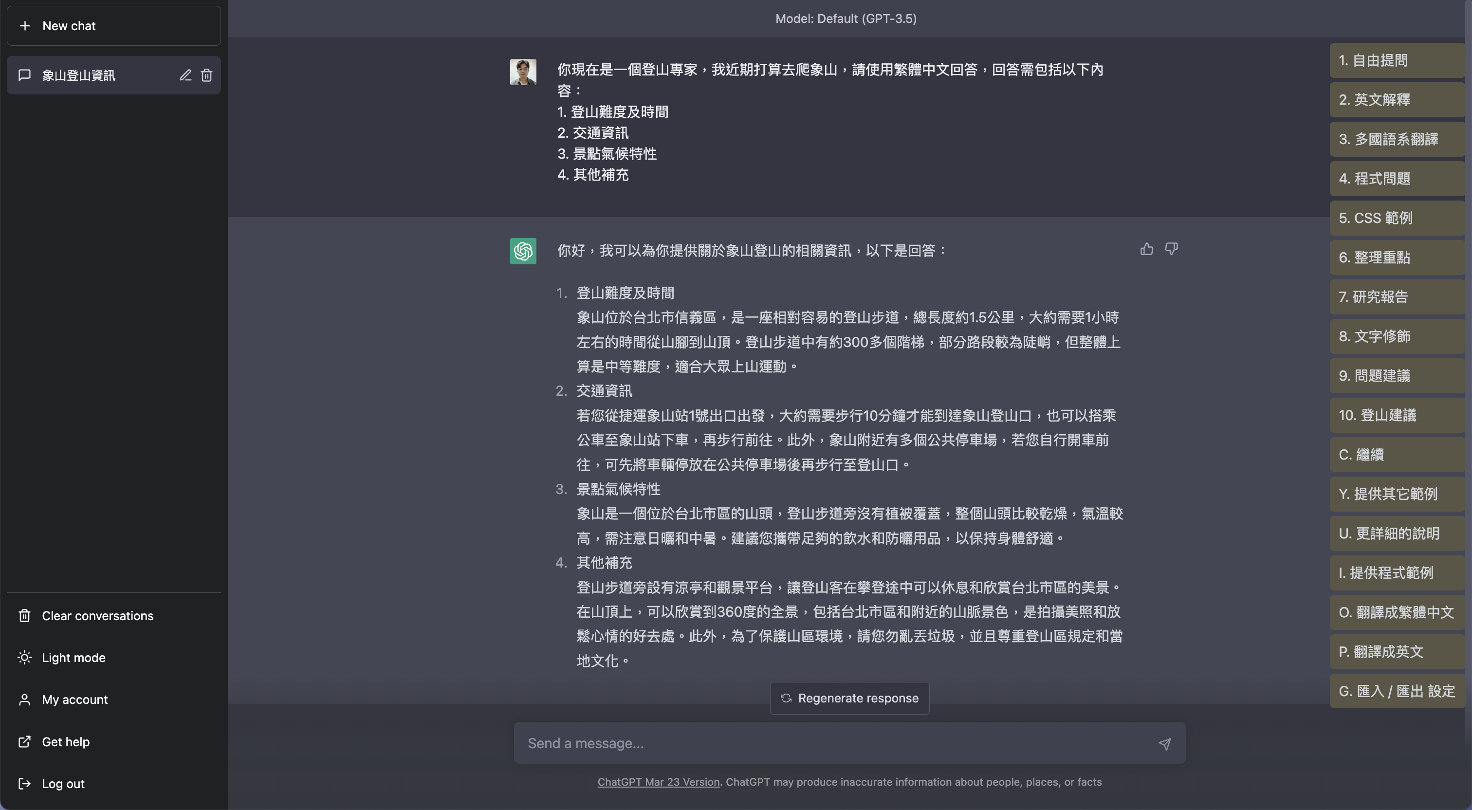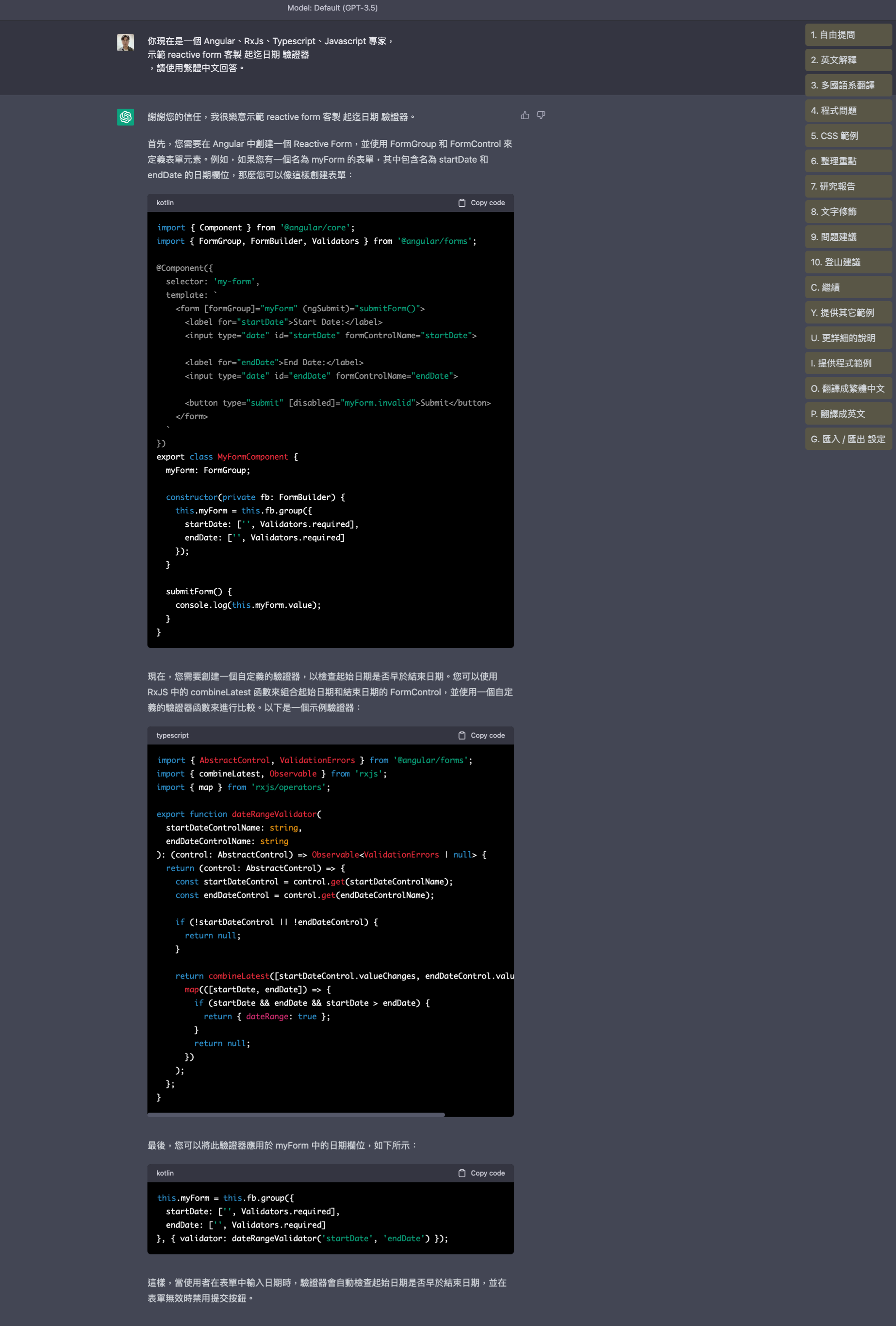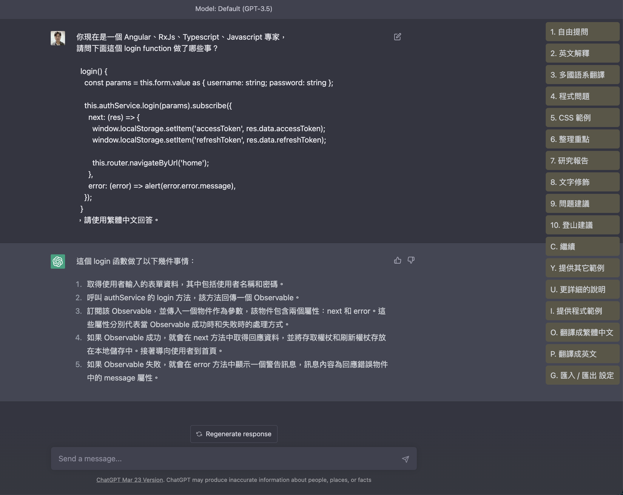 平時進行翻譯、查英文、程式範例、查詢公式...等可預期的提問,個人會習慣使用 3.5,因為較快,也不太會有問題。但若遇到思考上或是需要表達情境的問題,則會切換成 4.0 使用 (4.0 較具思考能力,但回答速度也會比較慢,而且官方有限制使用次數)。