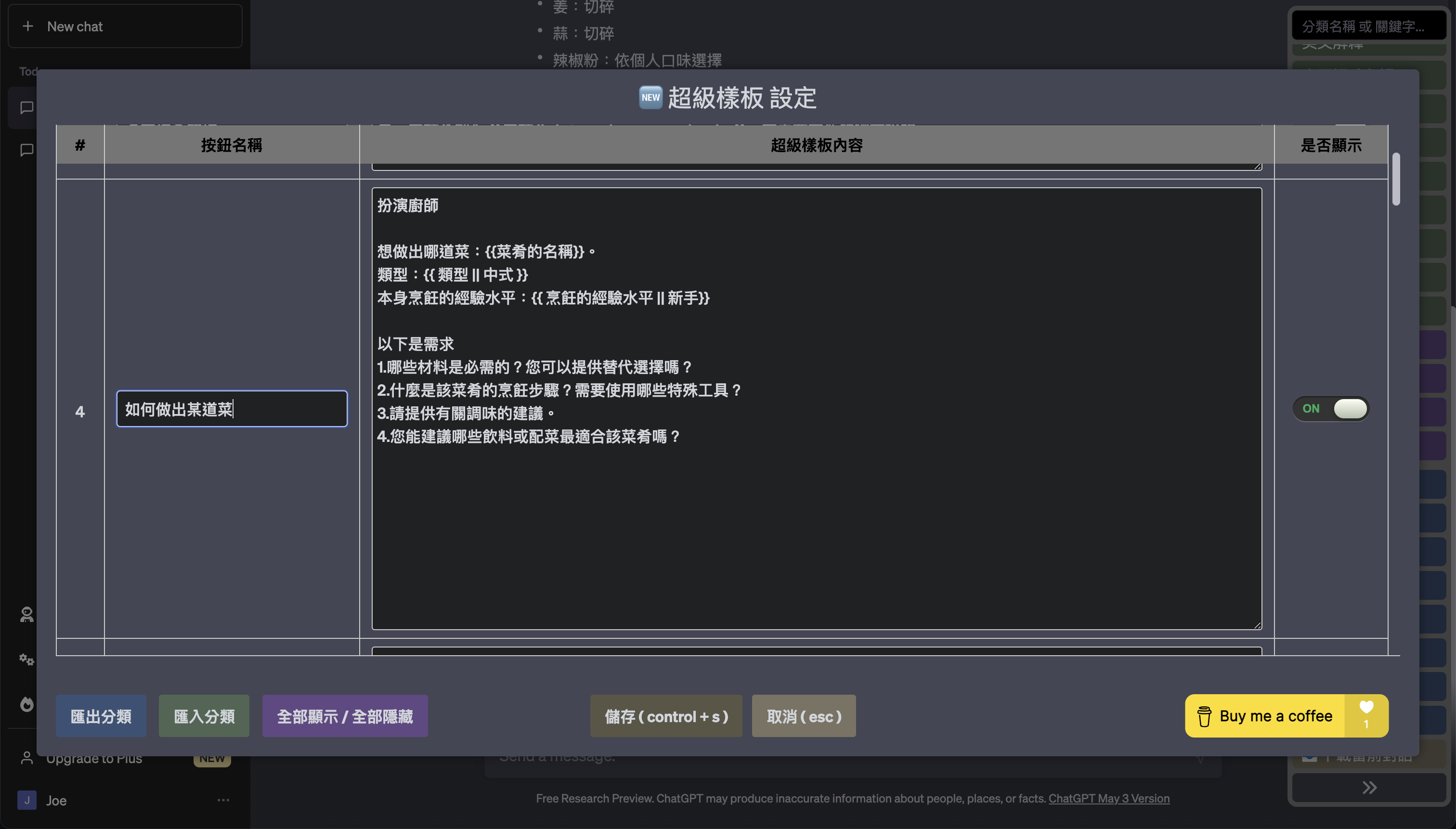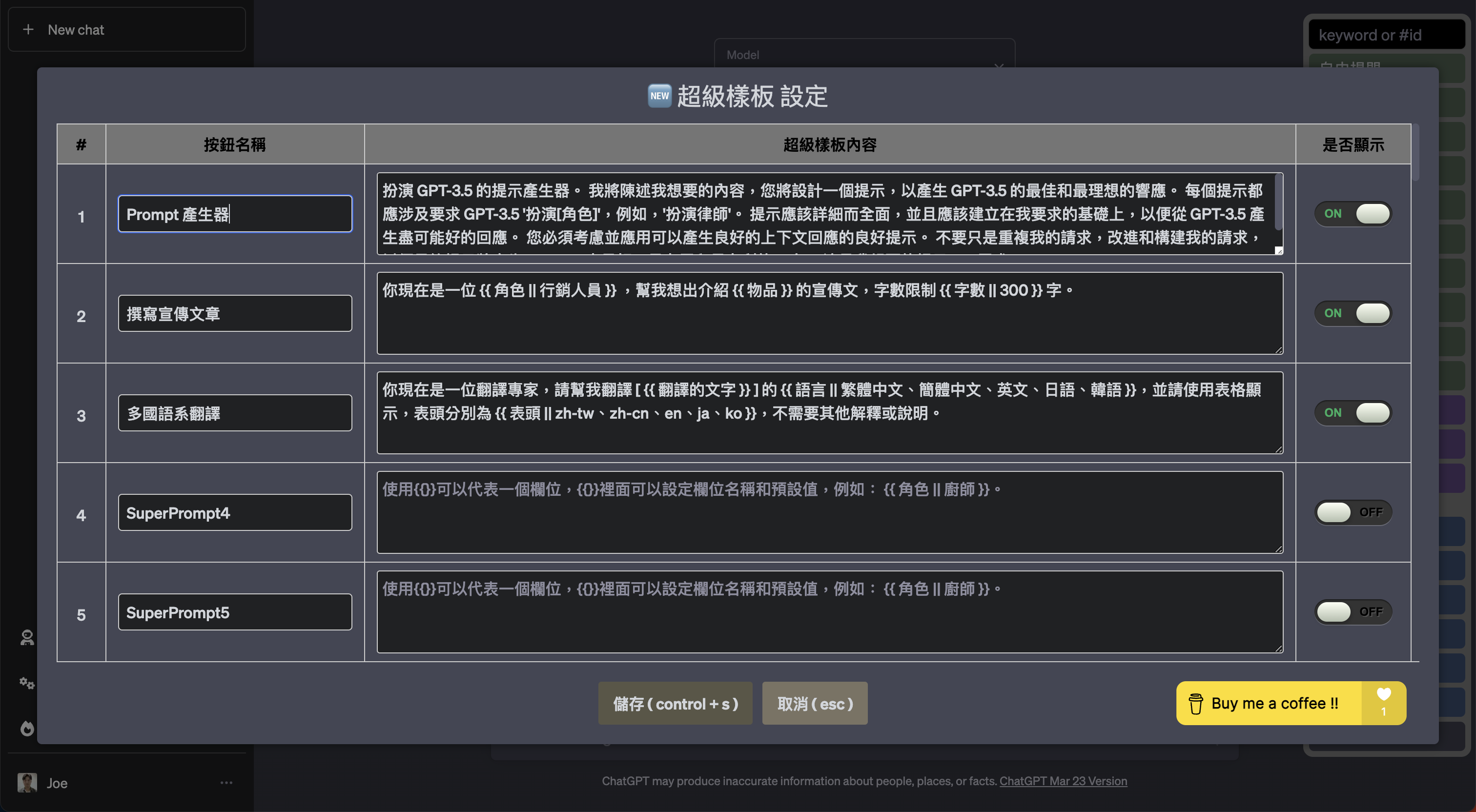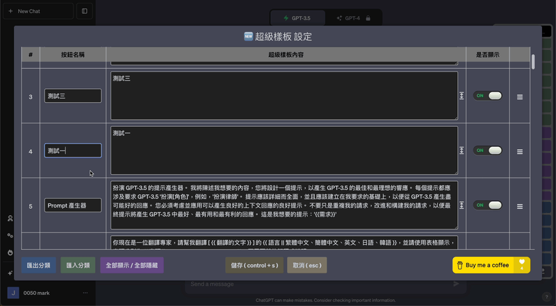 - 每個設定視窗的右下方增加 buy me a coffee 按鈕
