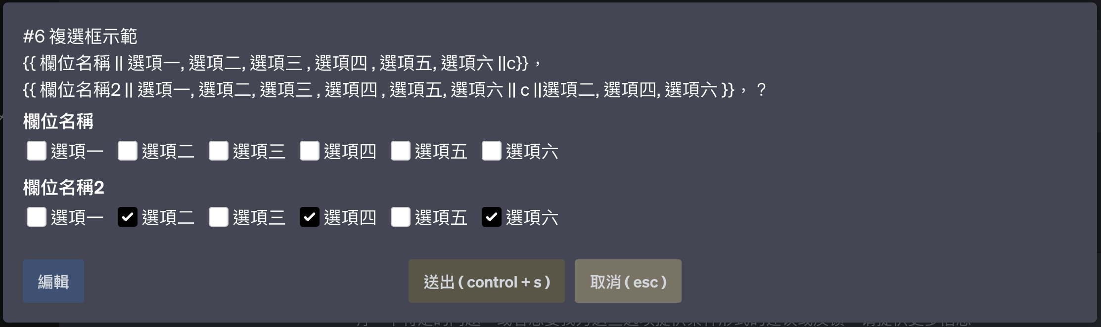 輸入 {{ 欄位名稱 || 選項一, 選項二, 選項三 , 選項四 , 選項五, 選項六 || c || 選項三 , 選項五 }} 可產生一個具有欄位名稱的複選框,且有預設值