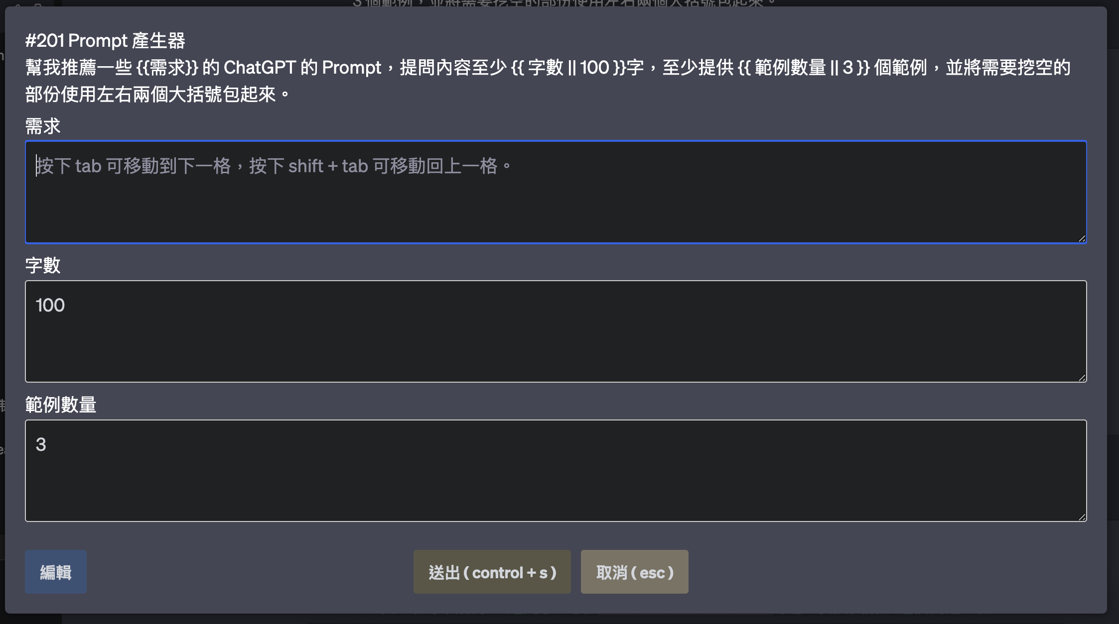 幫我推薦一些 {{需求}} 的 ChatGPT 的 Prompt,提問內容至少 {{ 字數 || 100 }}字,至少提供 {{ 範例數量 || 3 }} 個範例,並將需要挖空的部份使用左右兩個大括號包起來。