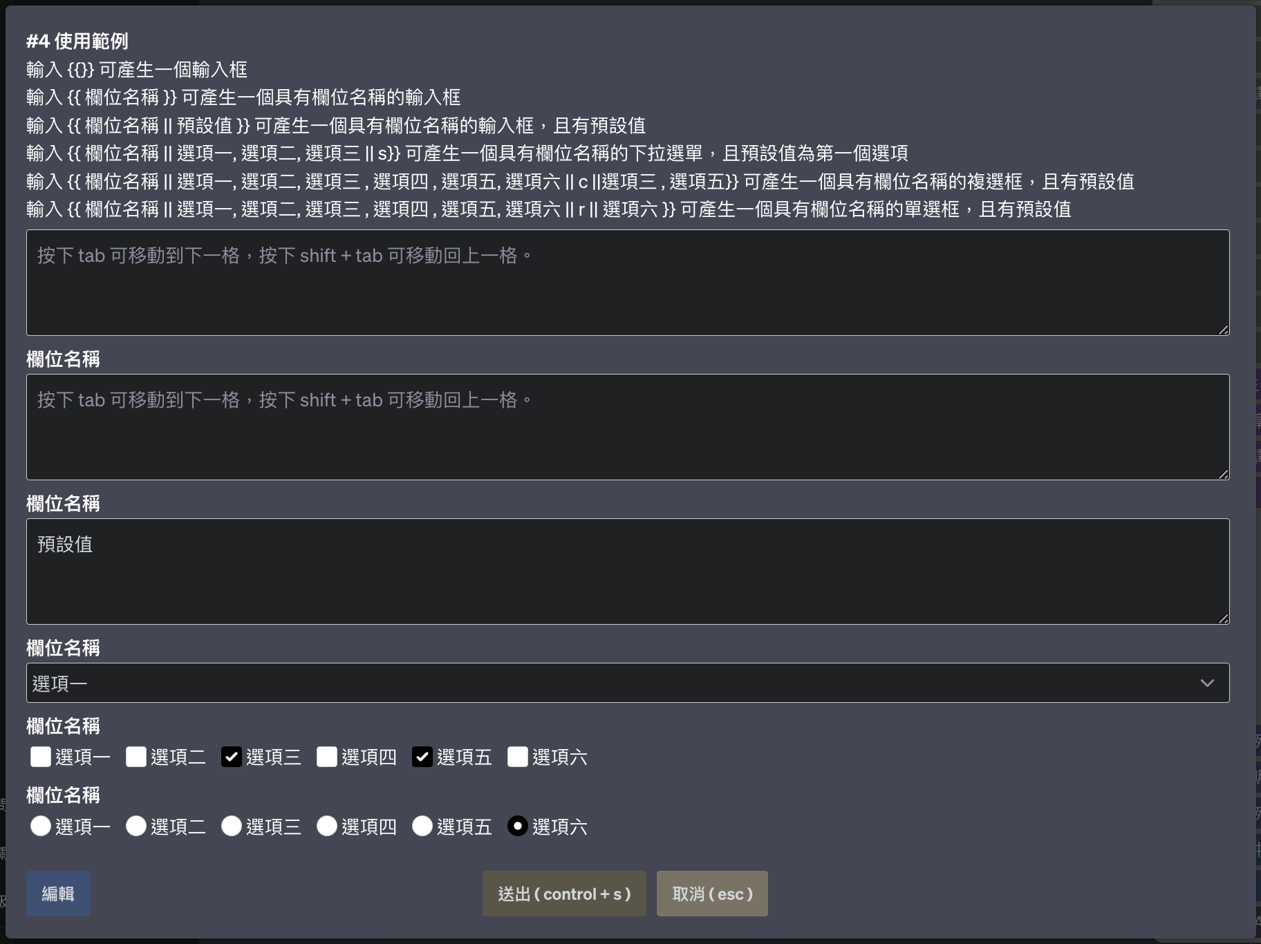 輸入 {{ 欄位名稱 || 選項一, 選項二, 選項三 || s }} 可產生一個具有欄位名稱的下拉選單,且預設值為第一個選項