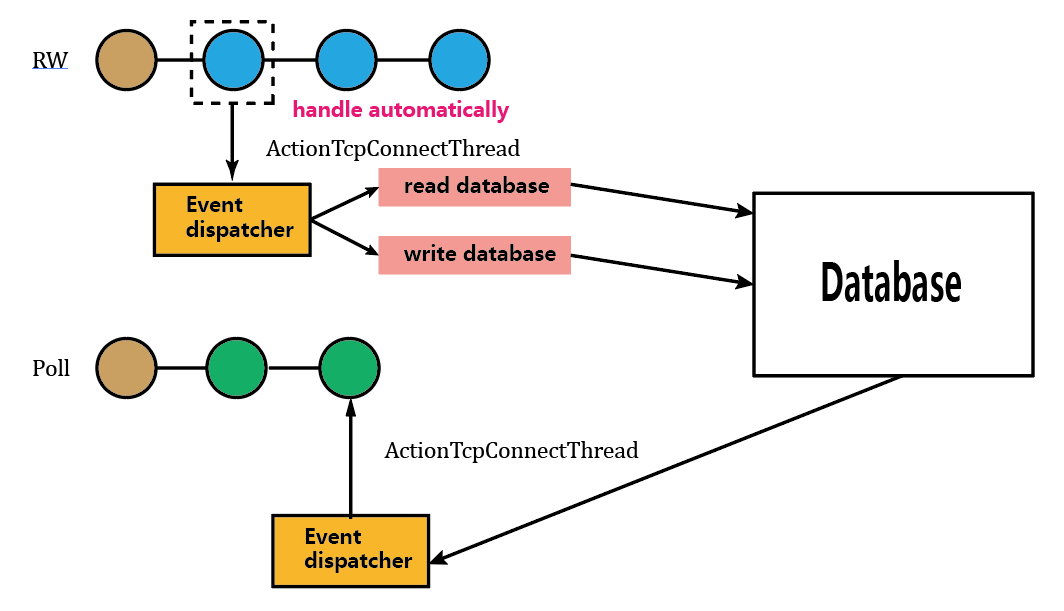 数据库读写后,如果有返回消息,则消息也会激发epoll_wait函数,促使ActionTcpEpollThread函数将消息反馈给客户端socket。