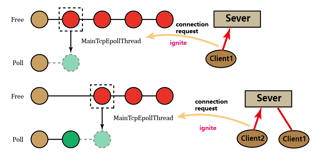与客户端建立连接后,从Free链表中取一个节点,向其添加信息,作为一个令牌,将这个令牌放入Poll链表,起到进程间通信的作用。