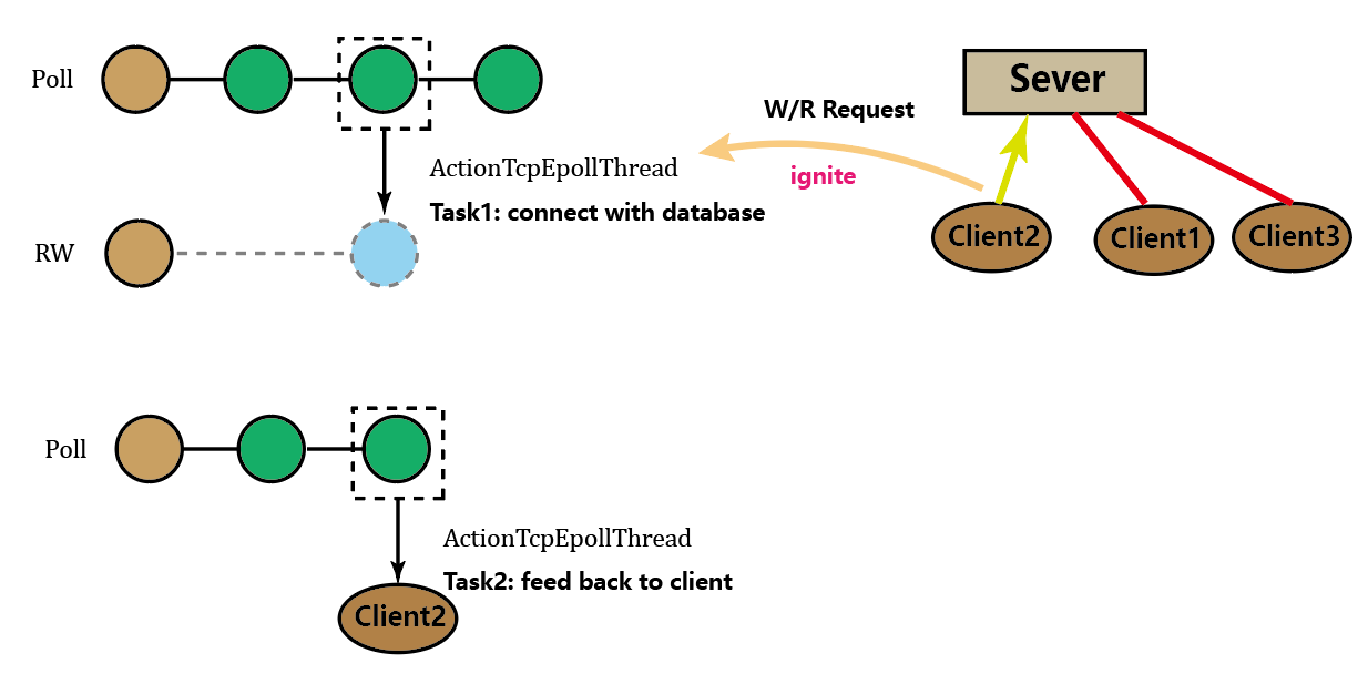 当客户端和服务器构建好连接后,客户端开始向服务器发送请求,请求激发了ActionTcpEpollThread中的epoll_wait函数,将请求写在令牌中,送入RW链表。