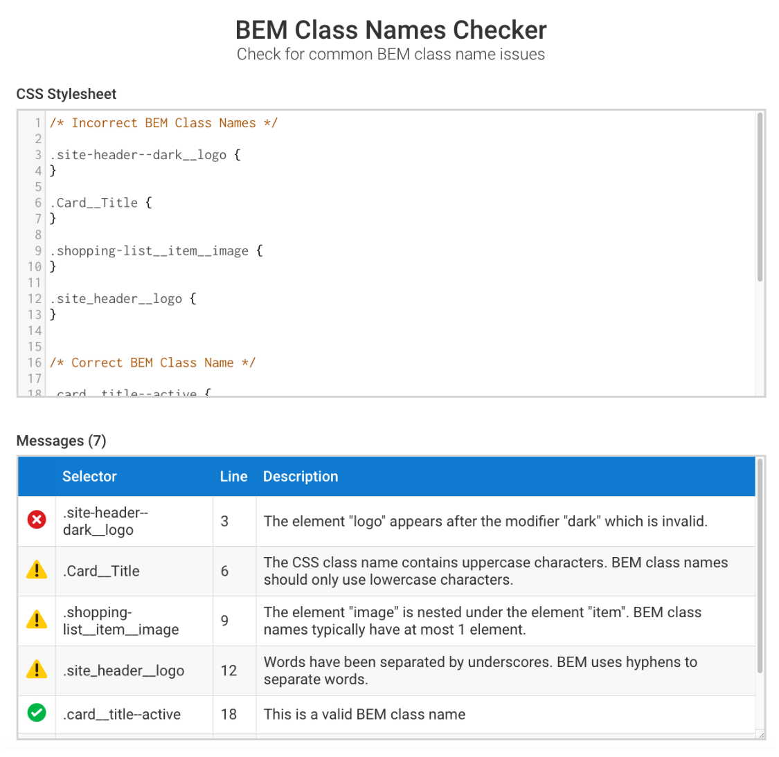 bem-class-names-checker Demo https://bem-class-names-checker.netlify.app/ Screenshot Project setup npm install Compiles and hot-reloads for development npm run serve Compiles and minifies for production npm run build Run your unit tests npm run test:unit Lints and fixes files npm run lint Customize configuration See Configuration Reference.