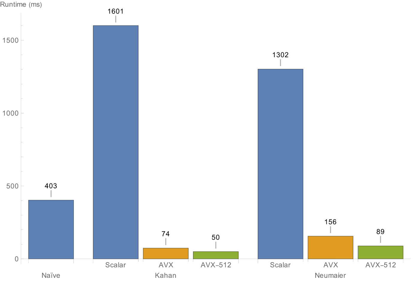 Now it's probably impossible to get that kind of numbers through the layers of abstraction Julia has... and there's not much sense to decide how many lanes to use for the user either. But some degree of autovectorization remains possible, so providing a way to pass in the desired # of lanes like sum_kbn(A; lanes) and cumsum_kbn(A; lanes) is probably good enough.
