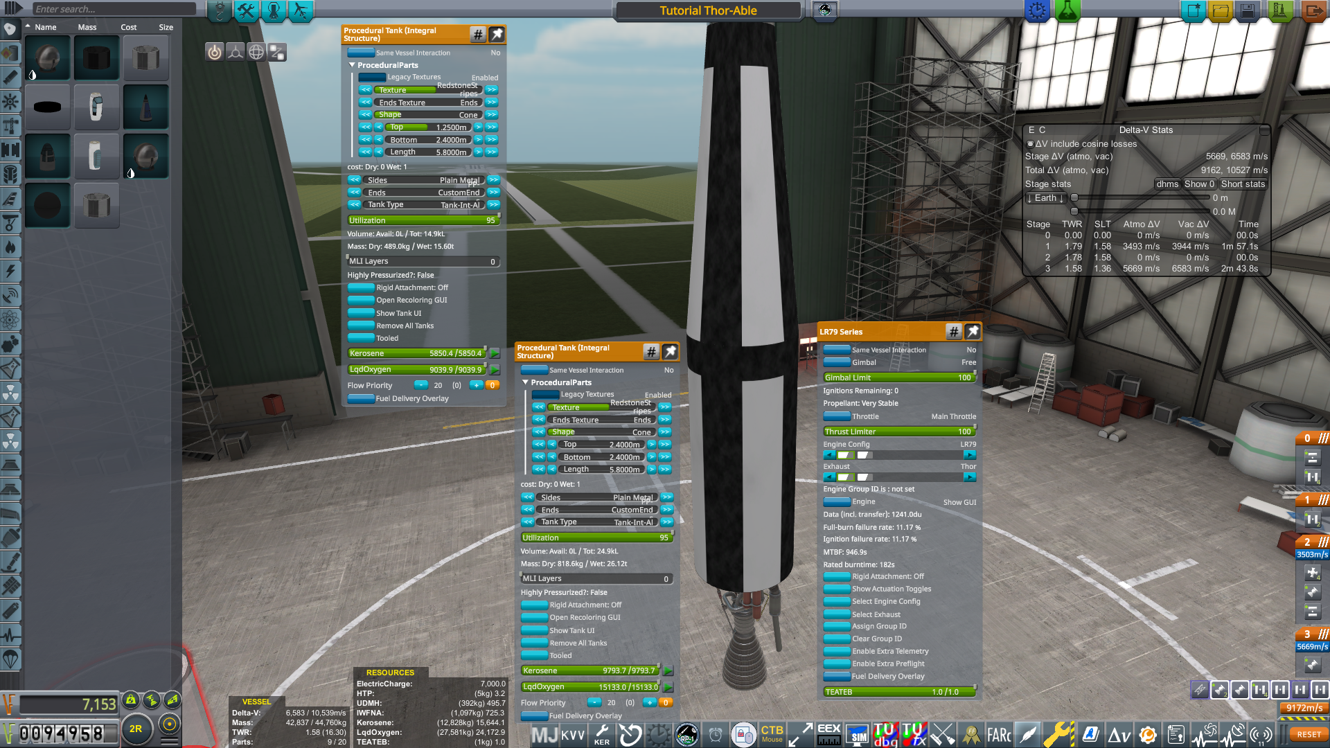 Select an LR79 engine and place it on the bottom of the rocket stack. Use the PAW of each tank to fill them with the correct mix of kerosene and liquid oxygen. Note that this engine will have the starting S-3 configuration, which is less powerful and less reliable than subsequent configurations. Make sure that the total burn time is less than three minutes, and that the initial TWR is somewhere in the range of 1.2 to 1.35 or so. As with the AJ10-37, upgrade the LR79 as soon as you unlock the 1958 Orbital Rocketry node. The second configuration ("S-3D") is more reliable and can be used for a year or two before upgrading again.