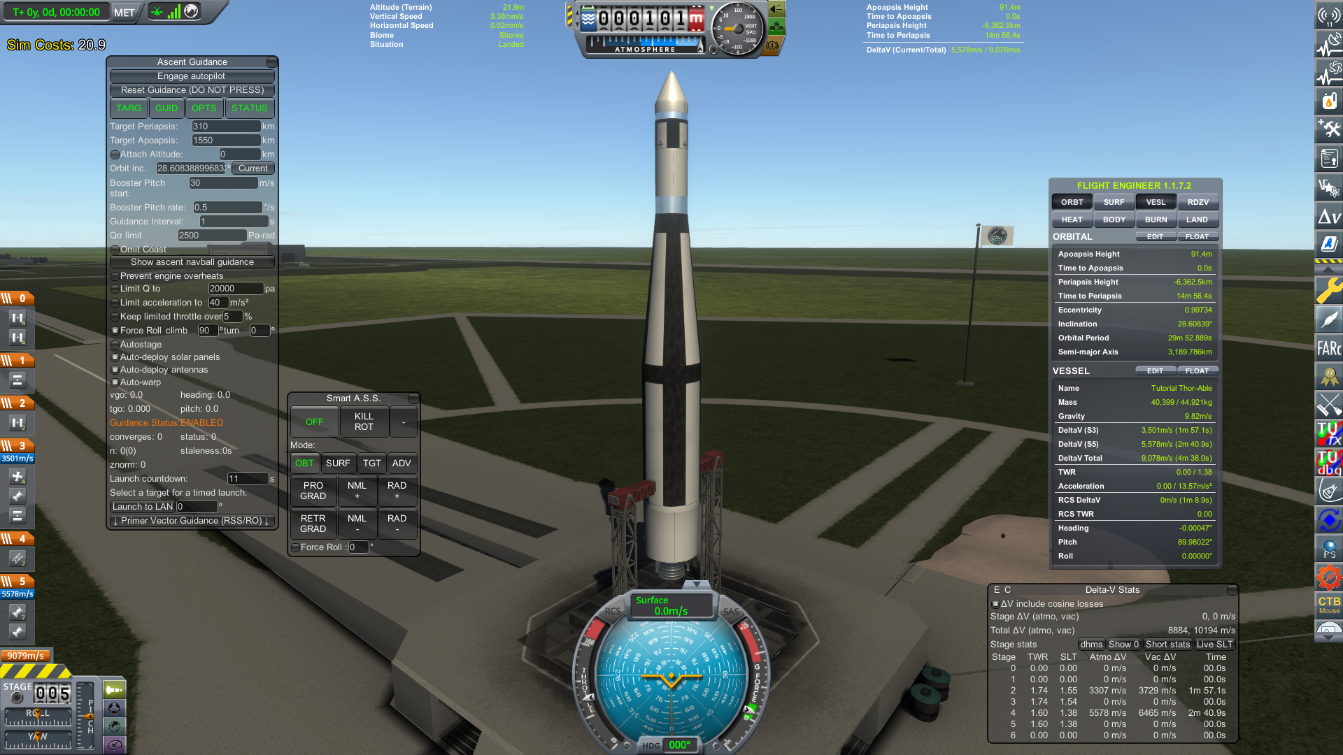 This demonstration rocket is launching into a 310 x 1550 km orbit, which should complete the First Science Satellite contract with delta V to spare. Once the first stage has burned out, let the rocket coast upward until it's above 140 km. Then ditch the fairing, separate from the lower stage, and activate the RCS and AJ10-37; or alternately, tick the Autostage box to turn it on. PVG will take it from there, delivering your satellite to the requested orbit. Detach the satellite from the upper stage (otherwise the upper stage avionics will drain the batteries quickly), and you're done! You can also fly this manually if you wish - should you choose this route, make sure you tip over enough so that the majority of the speed gained is horizontal rather than vertical. The sweet spot is somewhere between seeing a little bit of aerodynamic heating flames (good) and burning off the nose fairings (bad). If you're now in orbit for the first time (even just in a simulation), be sure to savor the moment.