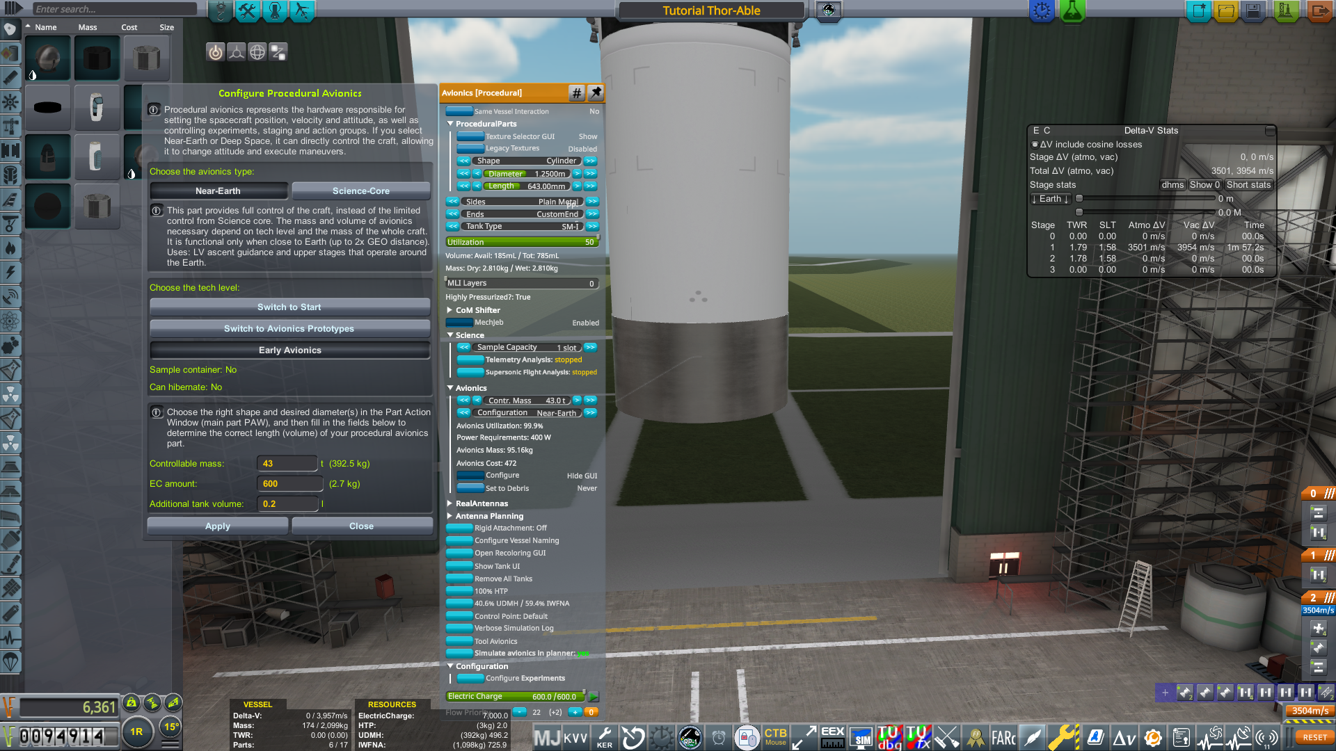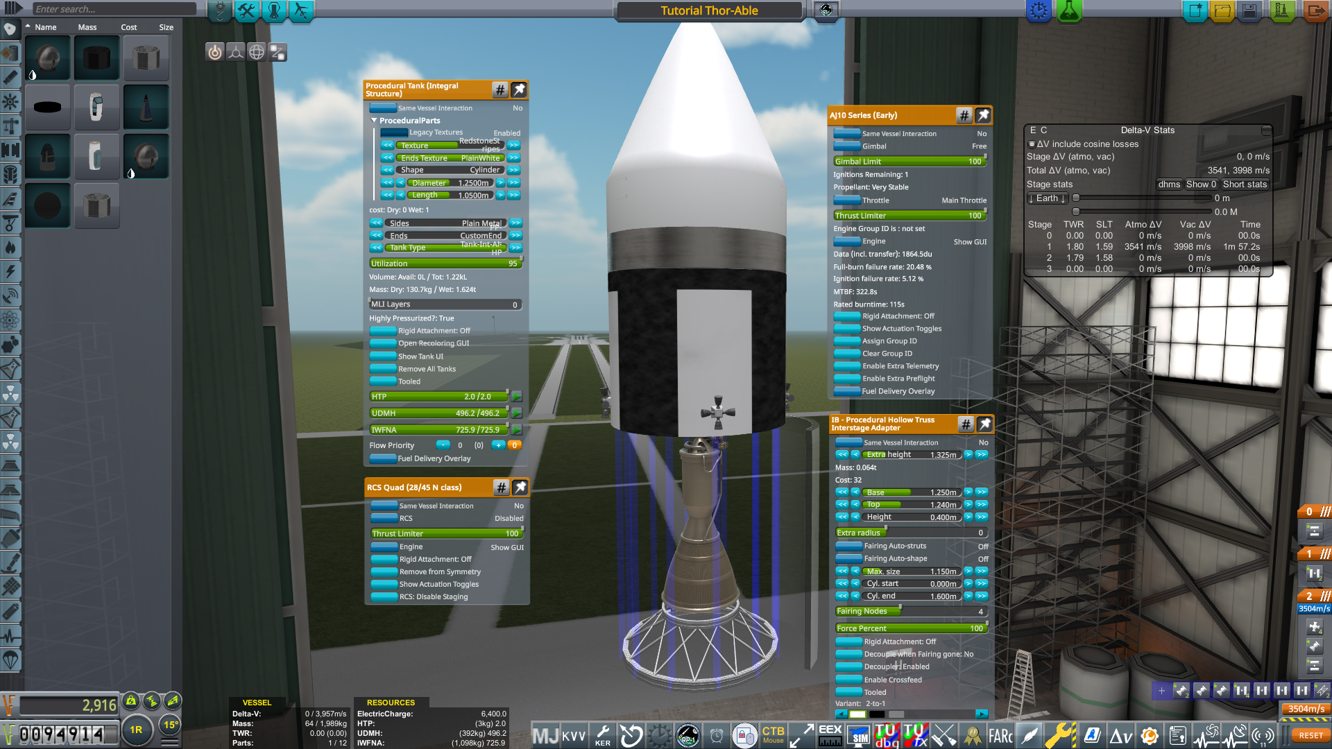 This will be a two-stage rocket, using an AJ10 (Early) upper stage and an LR79 lower stage. Both of these engines are unlocked in the 1956-57 Orbital Rocketry tech node. The rocket will also use isogrid fuel tanks, which are lighter and more capacious compared to earlier conventional (separate structure) fuel tanks. Continuing the visual theme established in the Early Career Tutorial, the example rocket will use the legacy Redstone texture for fuel tanks, and shiny metal avionics to make it easier to understand how the pieces fit together. Because the finished rocket will mass around 45 tons, make sure to order a 60-ton launch complex early enough that it will be ready in time for your first orbital launch attempts.