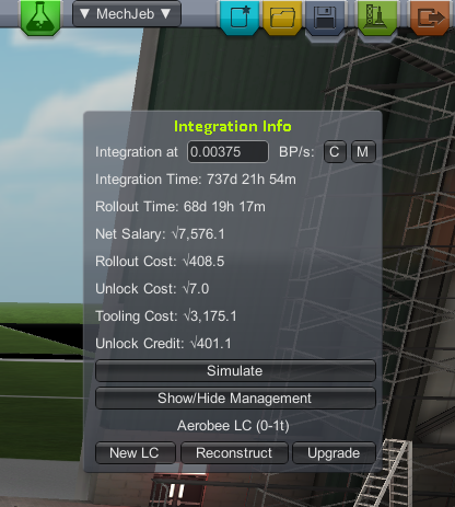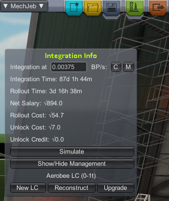 Take a look at the integration window. Remember it's the KCT gear icon if you need to open it. Now that we have assigned some engineers, this window gives us the time and money cost to build and launch this rocket.