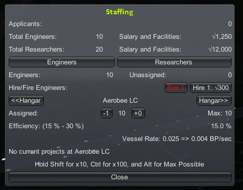 The staffing window has two tabs, engineers and researchers. Currently we have none of either. However what we do have are 20 applicants. Applicants can be hired for free. (You still pay them a salary.) If you have no applicants, then you must pay a one time fee of 300 funds to hire somebody, in addition to their regular salary thereafter. Until our Aerobee LC is built, we have no need for engineers, but let's hire some researchers! How about 20 to start?