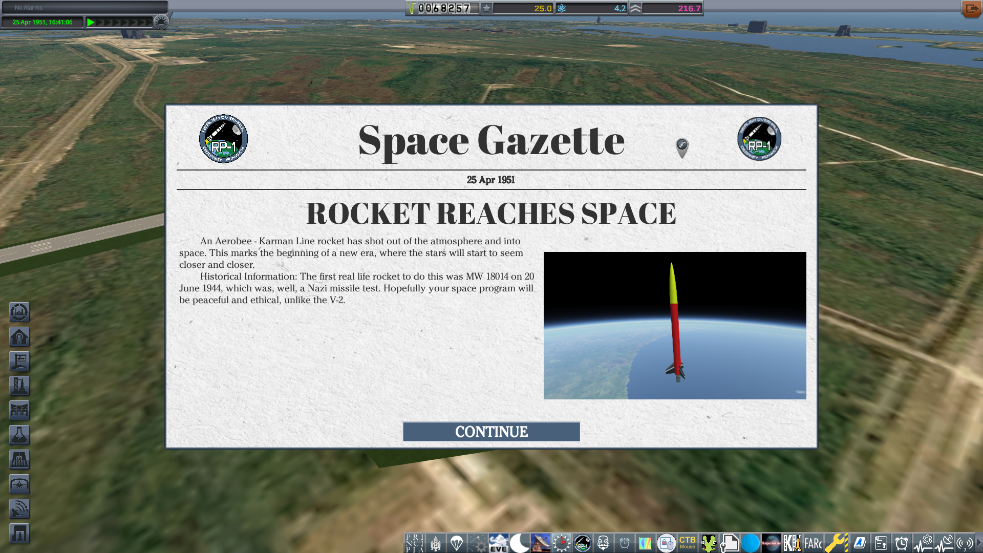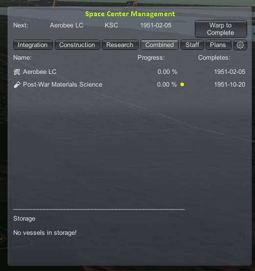 Everything in RP-1 takes time, from building rockets, to researching new technology. KCT manages this, and you'll be using this window a lot to manage the day to day operations of your space program.