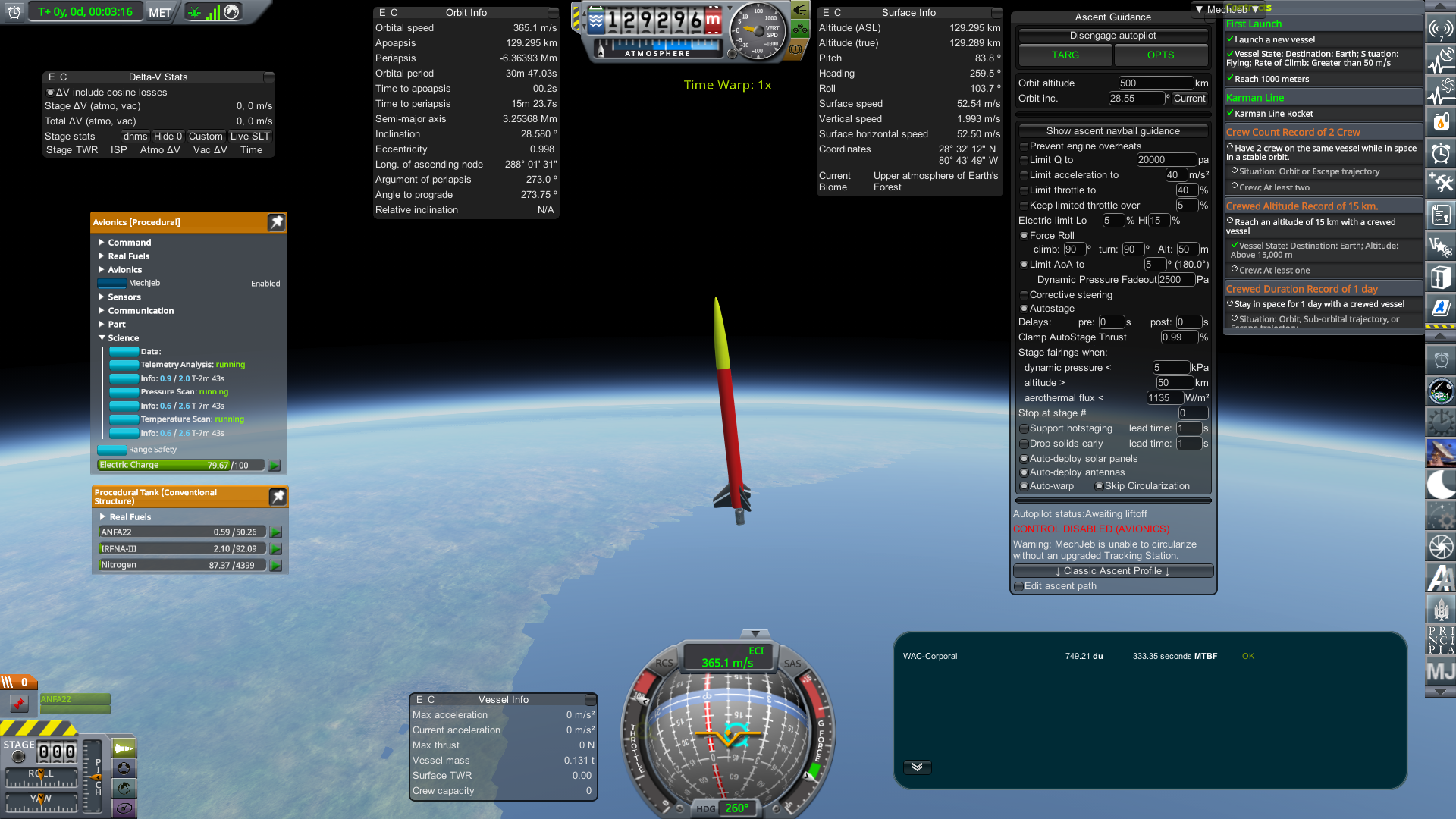When you're ready, launch the rocket. Ideally it will pass the Karman Line (100 km.) Mine made it to 129 km this time, which is more than enough to complete the contracts. Like in the sim, follow the rocket through its full flight, so you can gather the maximum amount of science possible. When it's below 40 km, you can use the range safety button in the avionics PAW to destroy the rocket. Return to the space center.