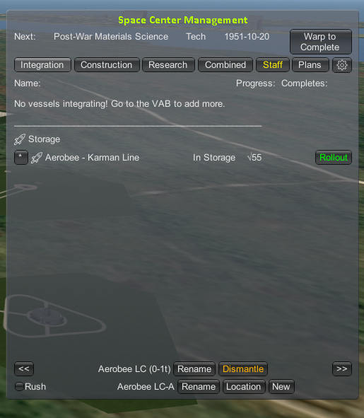 Now our Aerobee is listed under both the integration tab, and the combined tab. Take a look at the budget. We have now consumed all of our subsidy, and are paying a little bit out of our money supply for salaries. We are still well in the green, so this is fine. We're back to around where we started, about 50k. Let's hold on to that for now, since we have an expensive rocket to tool in our near future. The Aerobee will complete before our research, so when you're ready, click the warp to complete button.