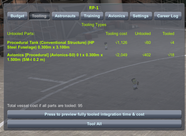 These numbers are pretty big, huh? We can do something about that! Tooling a rocket makes all future builds faster and cheaper. If you intend on building more than one of something it's almost always a good idea to tool it. Since we will build more Aerobees beyond just this one, let's tool it. Open up the RP-1 window and go to the tooling tab if it isn't already selected.