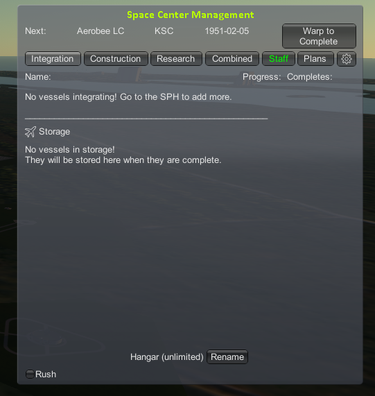 Go back to the KSC scene and click the gear icon again to open up the space center management window. Here we can control all of the Kerbal Construction Time (KCT) functions of our space program.