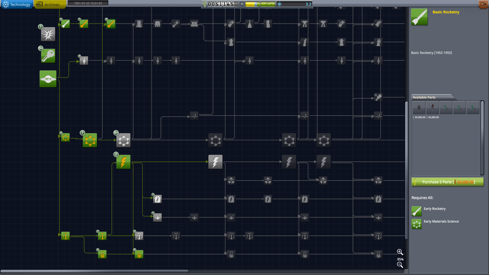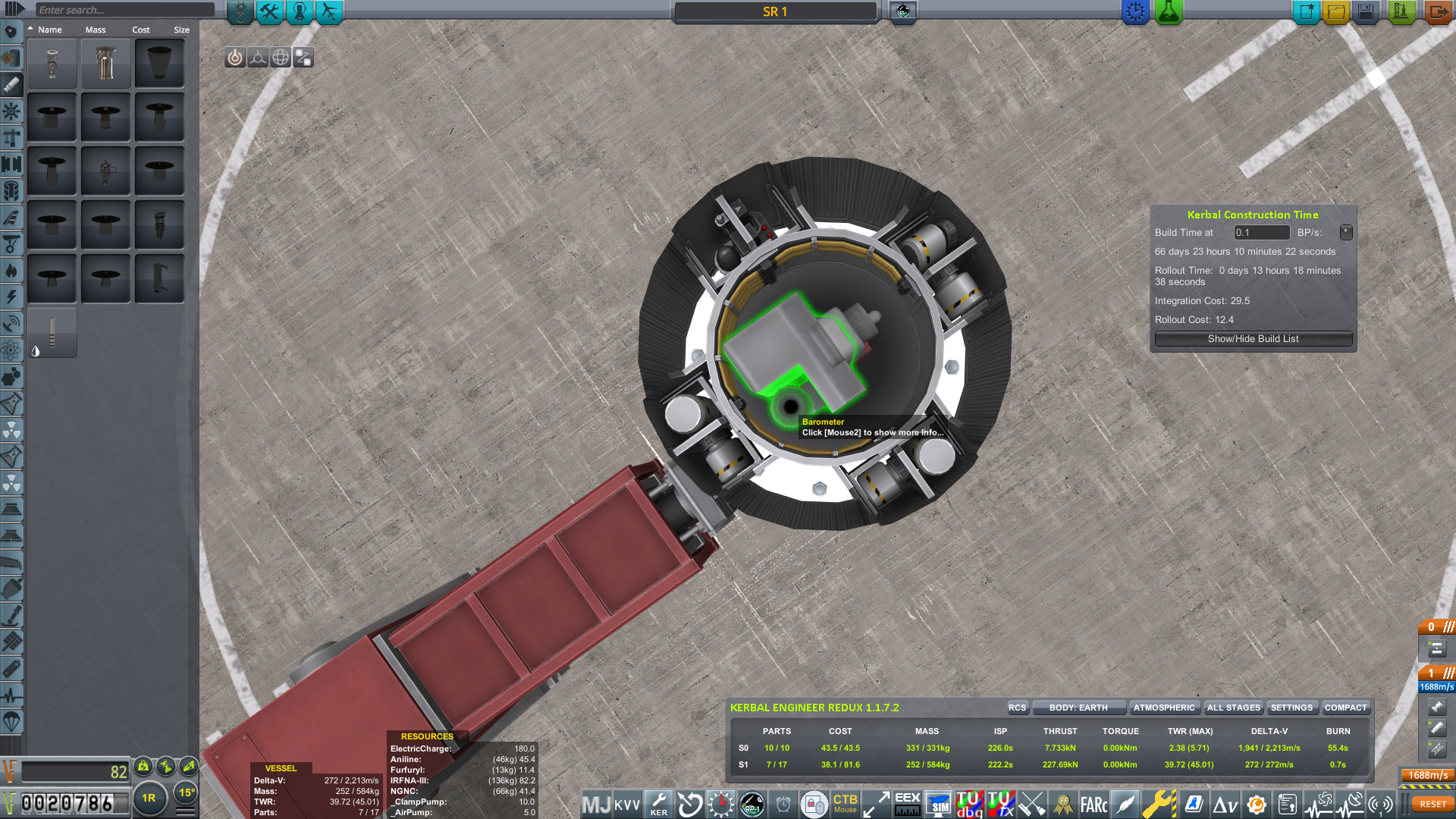 Also note that this rocket will require spending additional funds in the VAB for tooling the tanks and avionics, and possibly engine unlocks if you haven't already unlocked the XLR41 and XASR. This is one of the first times in an RP-1 career when you should limit your purchase of KCT points to make sure you have enough funds while designing your rocket in the VAB. Simply design, tool, and start constructing a few copies of the rocket first, then purchase any desired KCT points afterward.