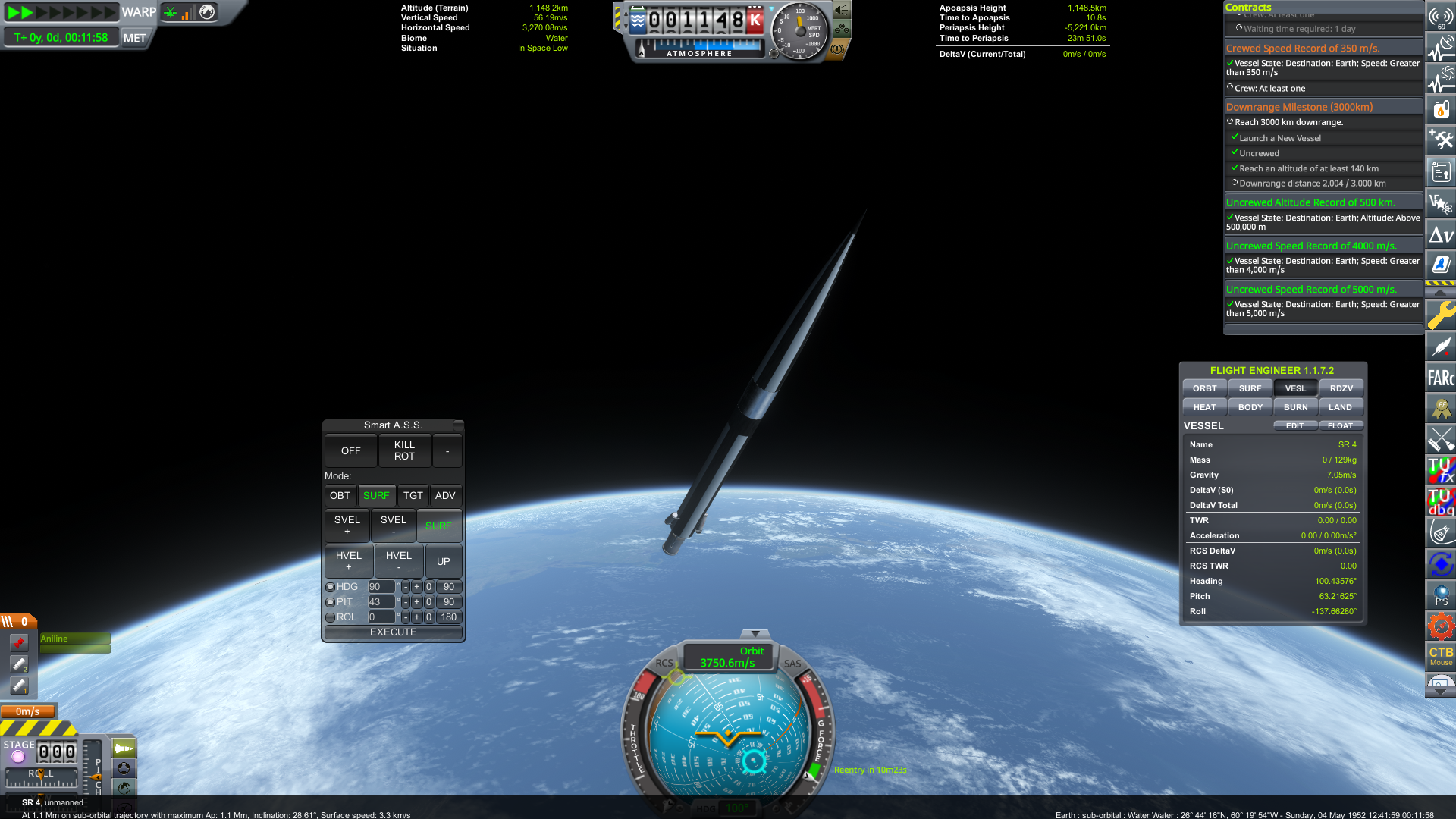 Once again, there are multiple routes to go forward. With recent changes to RP-1, there are now more and varied contracts to complete at this point in a career. Some players will choose to first fly a few of the bio sample missions or film missions for additional science with a Type 3 rocket, especially if the Post-War Rocketry Testing node isn't unlocked yet. Others will gain du on newly unlocked engines a bit more cheaply with sounding rocket altitude contracts or downrange launch vehicle development contracts. Aviation aficionados will be busy unlocking better cockpits so they can start their X-plane program. And a dwindling minority may still choose to build so-called “deathsticks” consisting of a cockpit on top of a Type 3 rocket, completing the Break the Sound Barrier contract that way. (While still a somewhat viable if ahistoric option, make sure to watch both heating and the altitude rating of whatever cockpit you're using. Also include enough parachutes so that your pilot survives the “landing”.)
