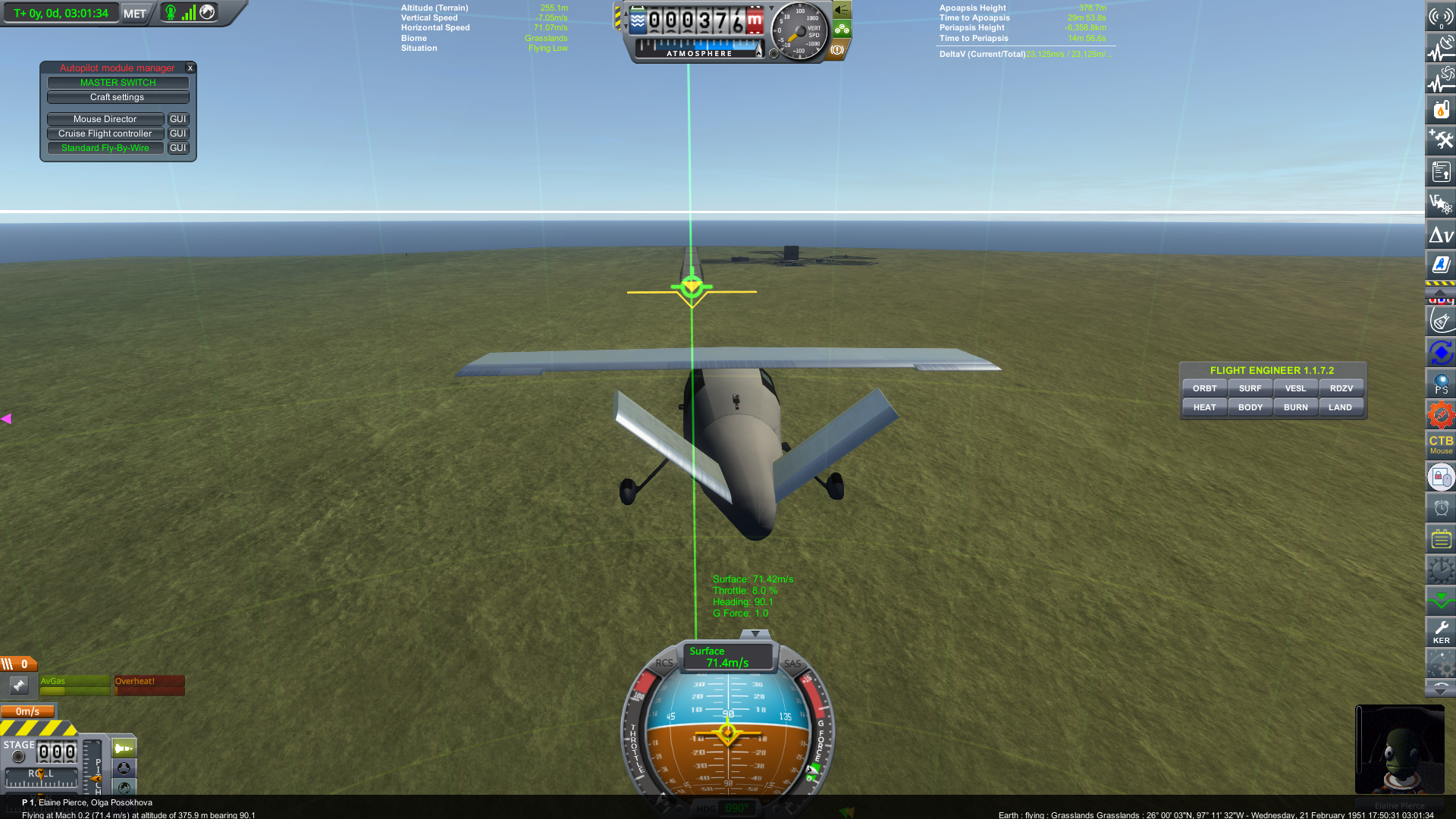 Flying planes is much easier with the Atmospheric Autopilot and NavHUD mods installed. Add them if you plan to fly planes to any significant degree. Here's NavHUD in action helping line up our Cessna analog on final approach.