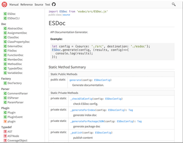 Classes, interfaces, functions, etc. are mapped and linked. If available, API docs are generated. Any markdown files found in the same folder are added to the page.