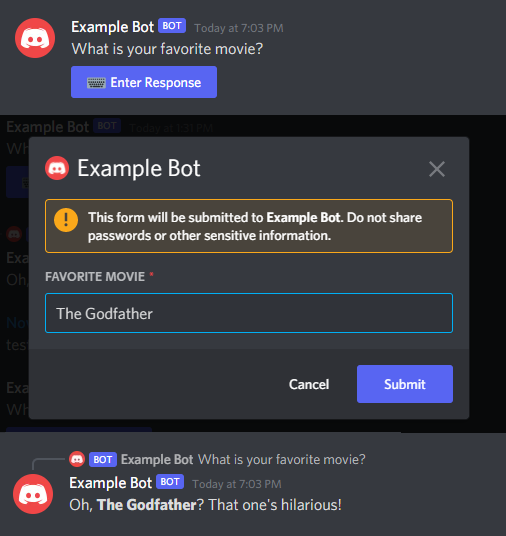 return { intr: modalSubmitInteraction, value: textInput.value };