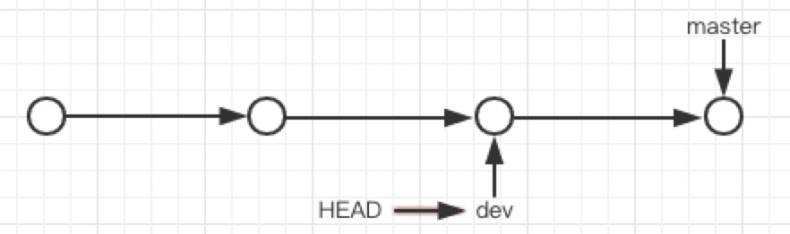 当出现我们上面图中的那种情况时,时间线只有一条,dev分支只不过是落后master分支而已。此时我们在dev分支上执行git merge maseter时,git就仅仅会把dev分支指针移动到master分支所在的位置,假装合并了,就变成了这样: