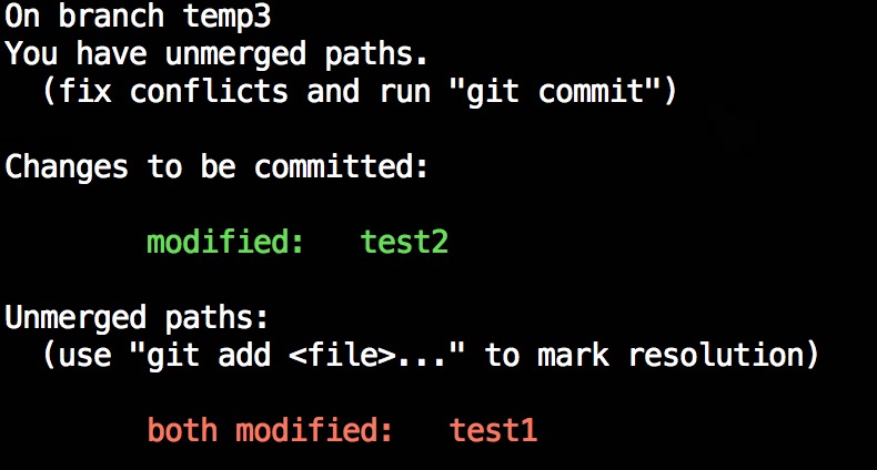 上面绿的的东西自然就在暂存区了,这些代表dev分支上并不冲突的部分。下面的红色文件就代表你冲突的文件,当你修改之后需要走一遍add -> commit的流程(这个commit可以不指定commit message),也可以直接执行git commit -a,就完成merge创建新commit的过程了。
