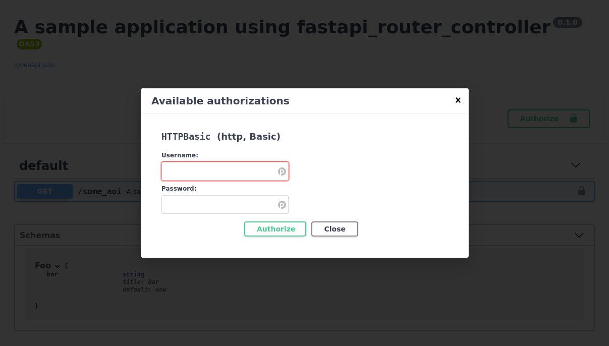 Here we see a Fastapi CBV (class based view) application with class wide Basic Auth dependencies.