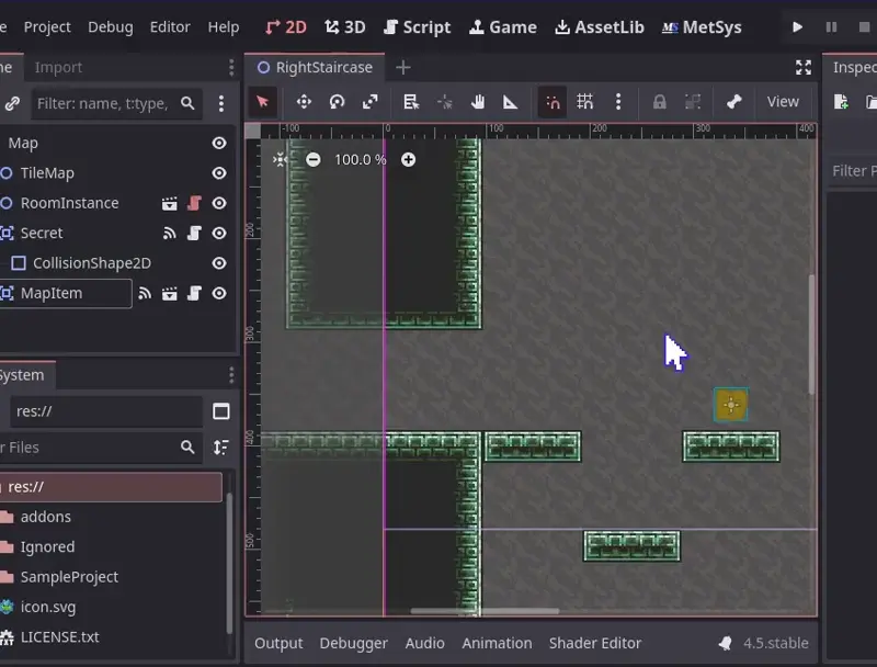 Storable objects are anything that you'd want its state to be stored (saved), e.g. switches, breakable walls, collectibles. The idea is that every object has an ID that identifies it. Mark an object as storable when it's being initialized (_ready()), providing a callback for when the object is already stored (usually queue_free()). If the object was already stored, the callback will be immediately called. If it's not, you call the store method at a specific event (the player pulls a lever, collects an item etc.). Objects can be either stored or not, and stored state can't be reverted (using the public API at least). If you need more object states or toggleable states, you can take advantage of MetSys' object IDs. Example storable object implementation: