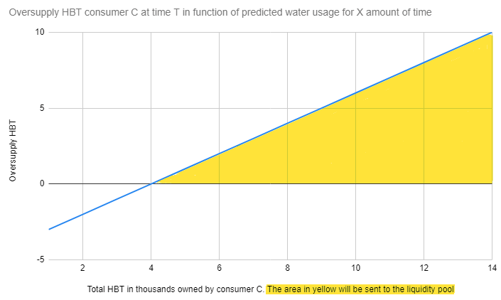The oversupply of HBT for each consumer at a time T can be defined as as having more tokens then needed to cover X amount time of water usage, based on an average of the usage in the past.