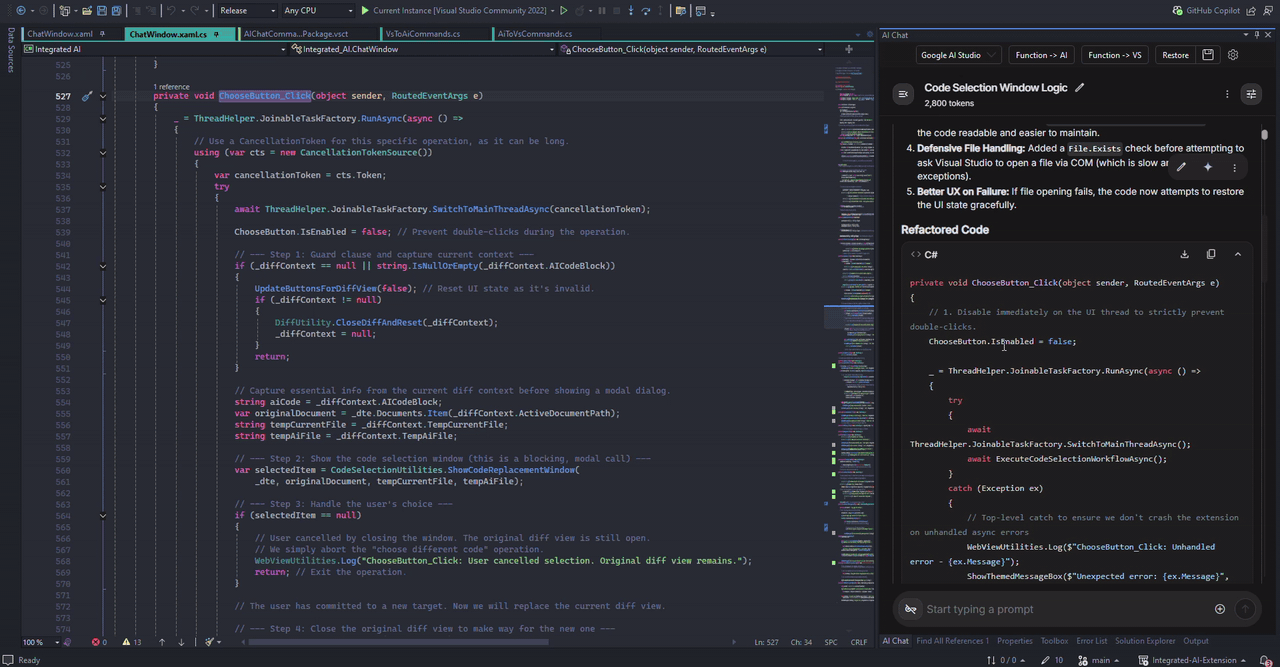 - Integrated AI Chat Window: Open an AI chat web interface in a dockable Visual Studio tool window.